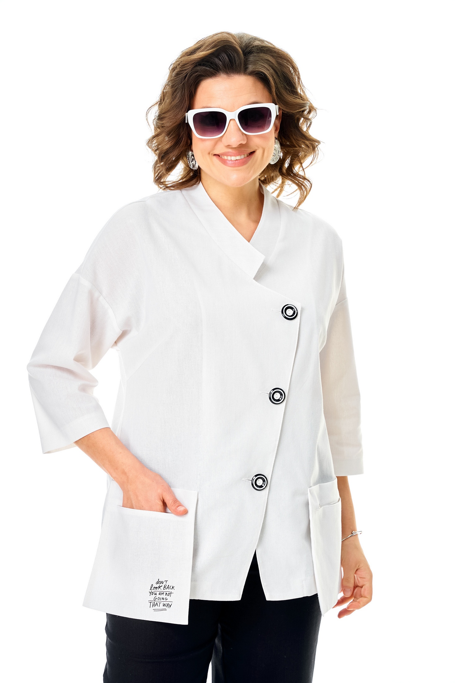 Костюм брючный 1345 бело-черный Anastasia сочетает в себе стиль и комфорт, который предлагает коллекция бренда Anastasia. Этот костюм изготовлен из полиэстера, хлопка, льна и вискозы, что обеспечивает мягкость и дышимость. Жакет свободного кроя с V-образным вырезом и асимметричной застежкой на пуговицы дополняется накладными карманами, один из которых украшен декоративным принтом. Рукава длиной 3/4 и спущенная линия плеч делают образ легким и актуальным. Брюки прямого укороченного силуэта и средней посадки обеспечивают удобство благодаря резинке на поясе и боковым карманам. Этот костюм идеально подходит для офиса, прогулок и путешествий. Длина спинке составляет 70-73 см, длина рукава - 33 см, а длина брюк - 93-95 см.