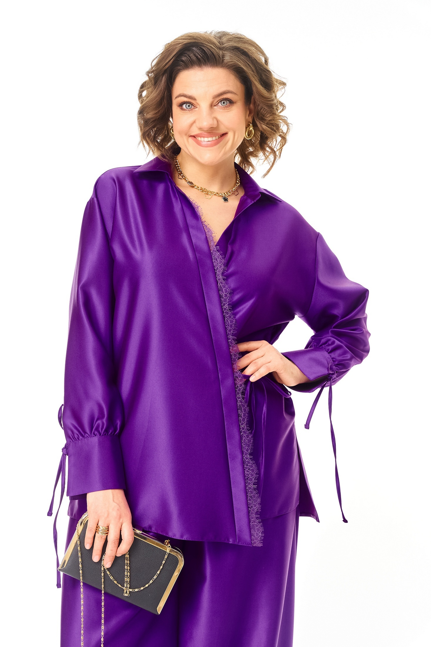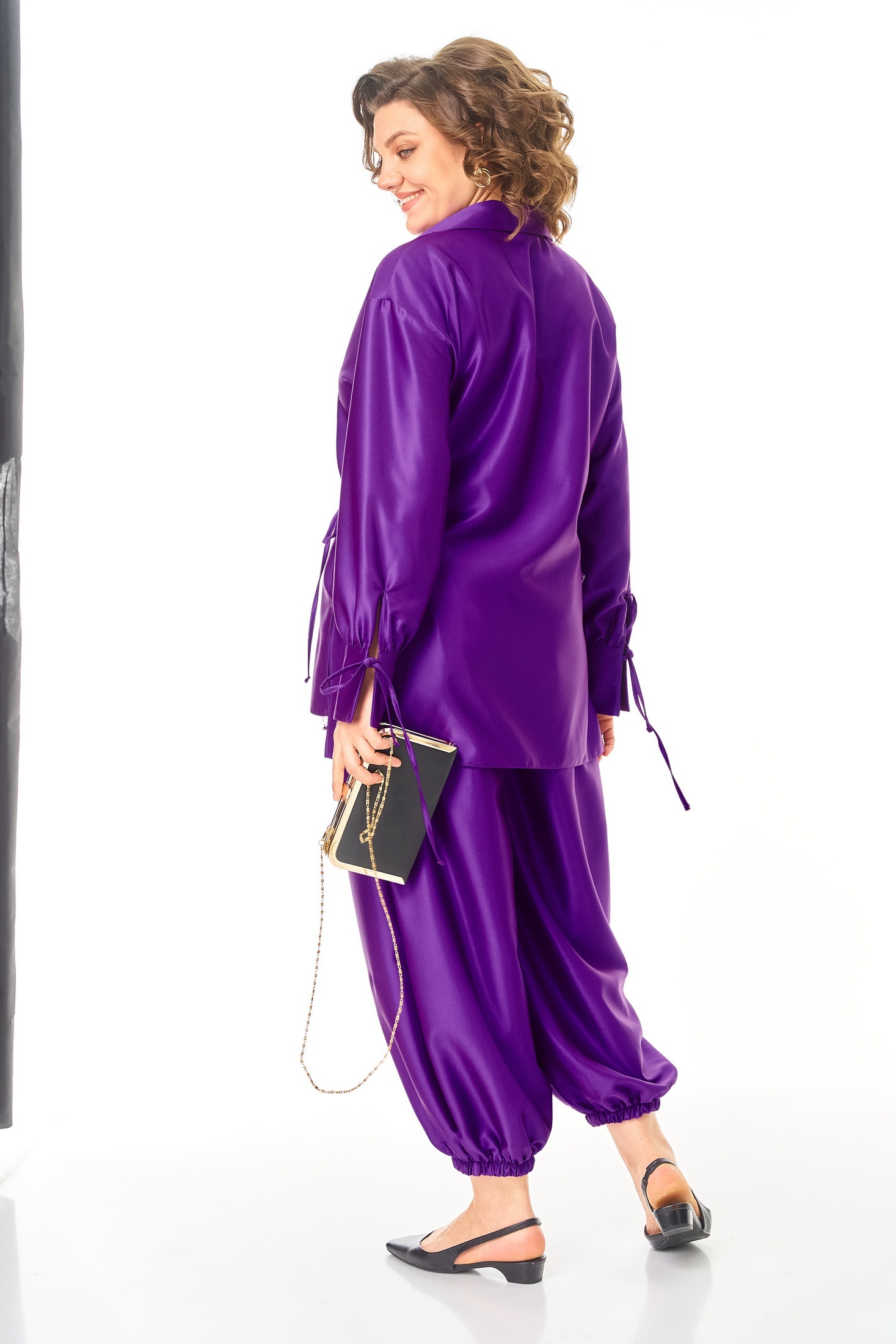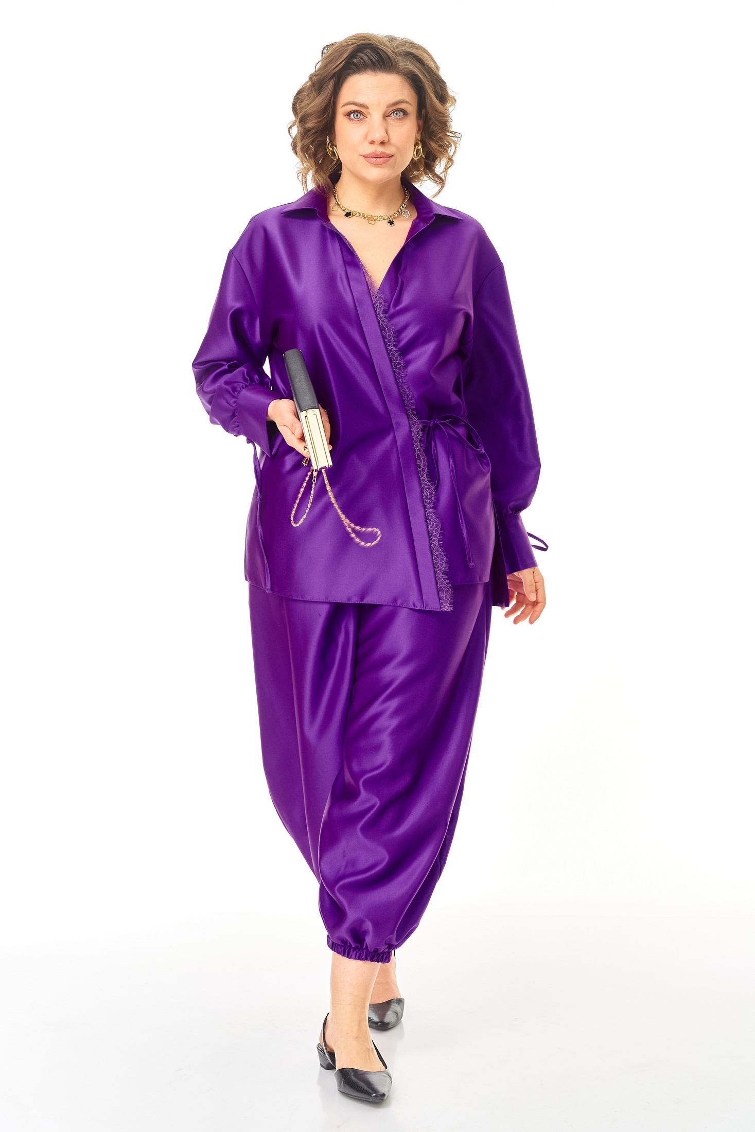 Костюм брючный 1358 Anastasia от бренда Anastasia — это сочетание стиля и удобства. Коллекция бренда предлагает уникальный вариант для повседневного ношения весной и летом. Комплект включает блузку и брюки из мягкой ткани с полиэстром и вискозой, что обеспечивает комфорт и износостойкость. Блузка прямого силуэта с разрезами по бокам, сборкой на манжетах и завязками, а также воротником на отрезной стойке. Декоративная кружевная отделка и запах с завязками создают женственный образ. Брюки-алладины с эластичным поясом и удобными карманами обеспечивают удобную посадку. Они заужены книзу благодаря резинке, визуально удлиняя ноги. Длина по спинке варьируется от 76 до 79 см, длина рукава — от 57 до 59 см, длина брюк — от 95 до 97 см. Яркий фиолетовый цвет добавляет образу выразительности.