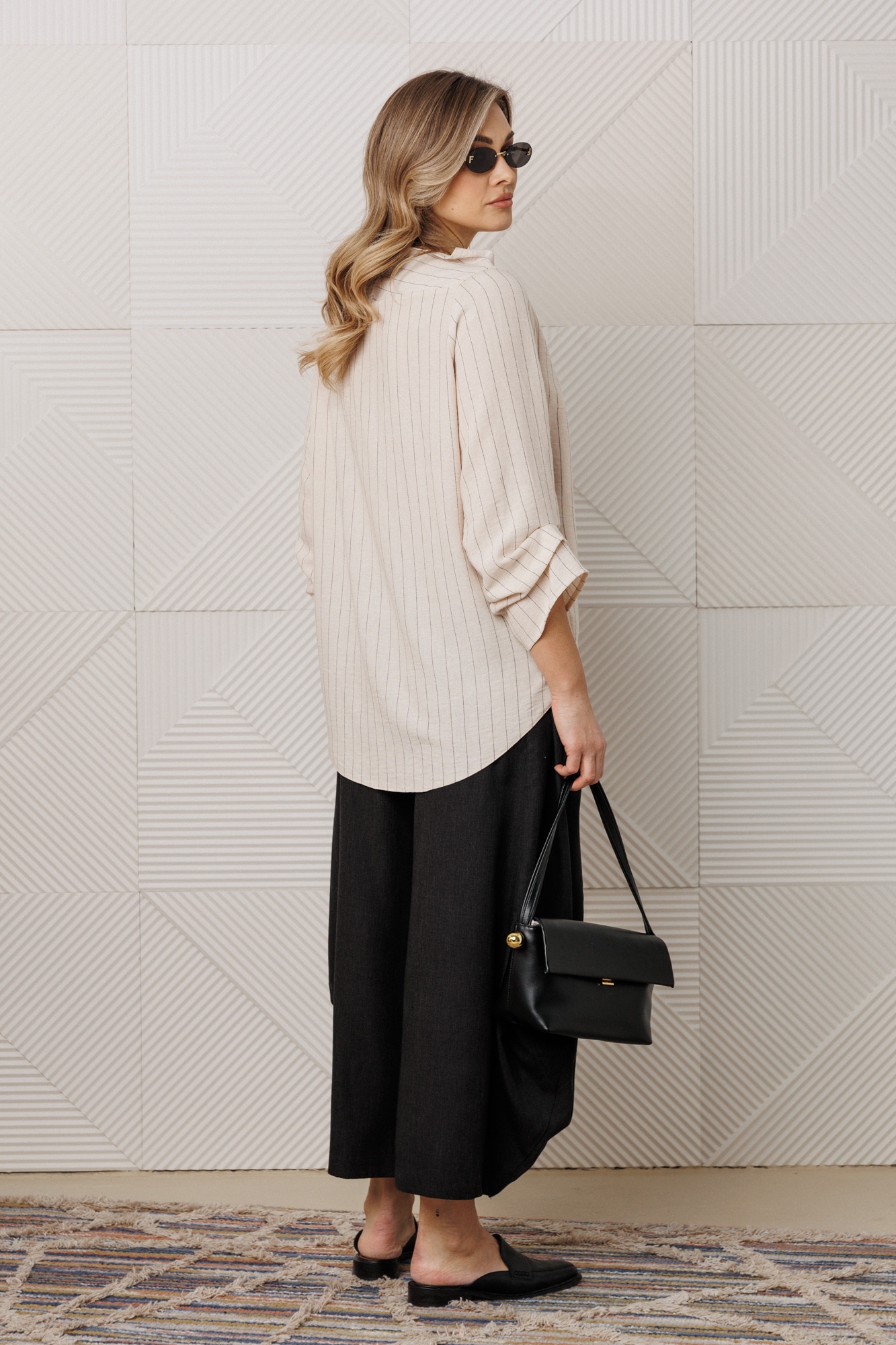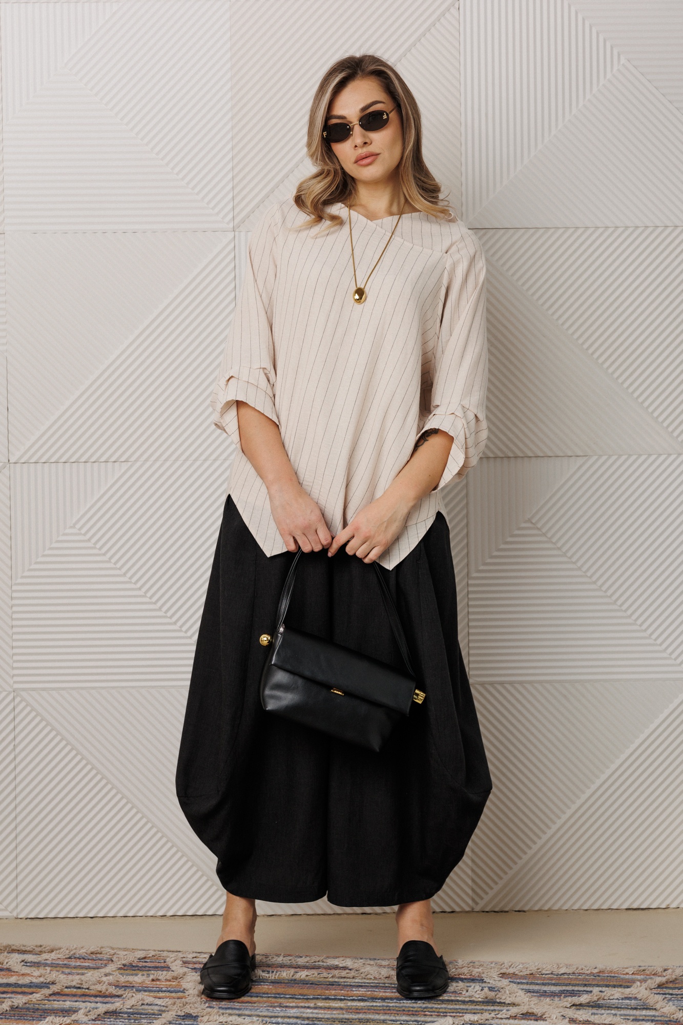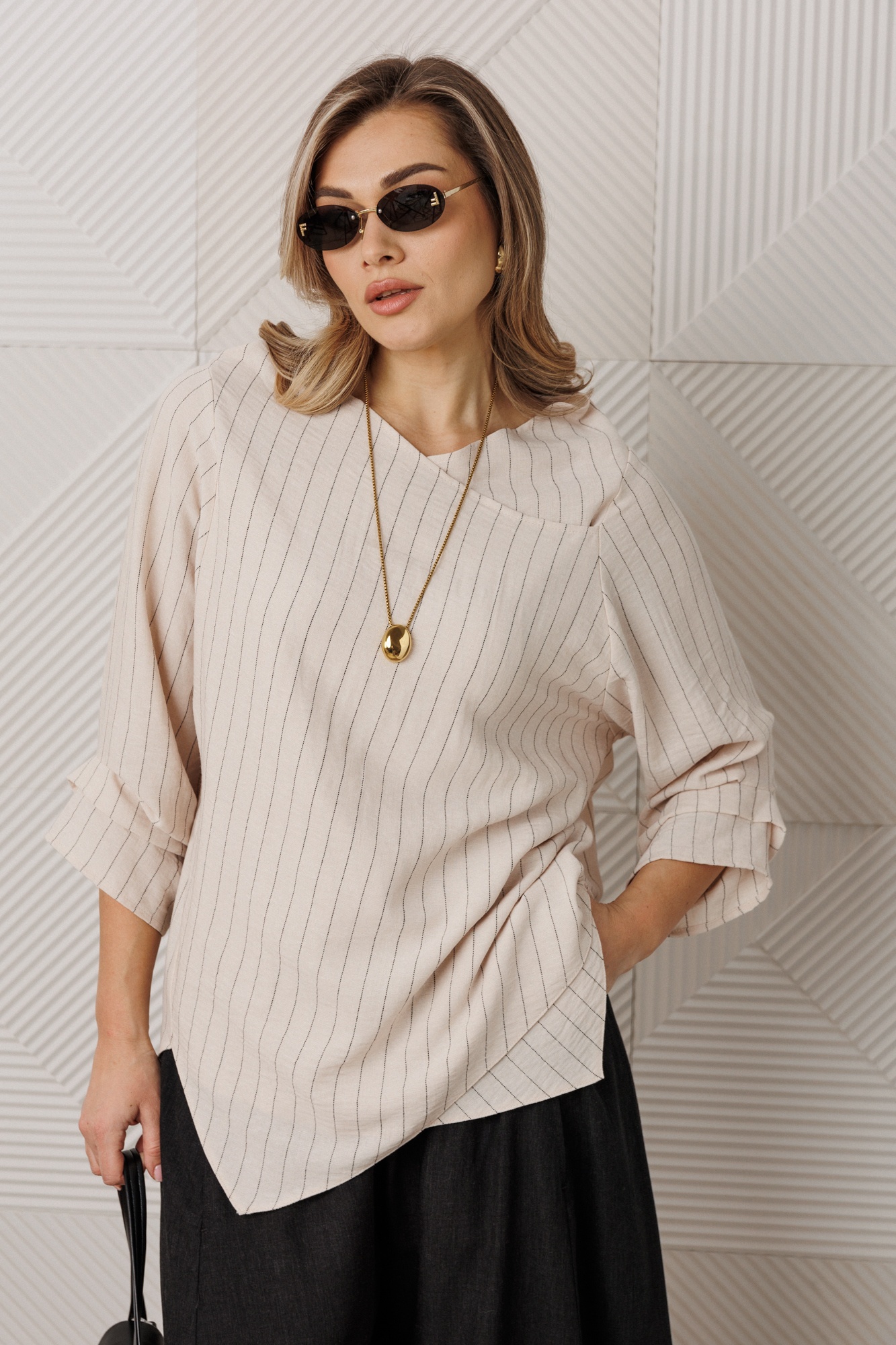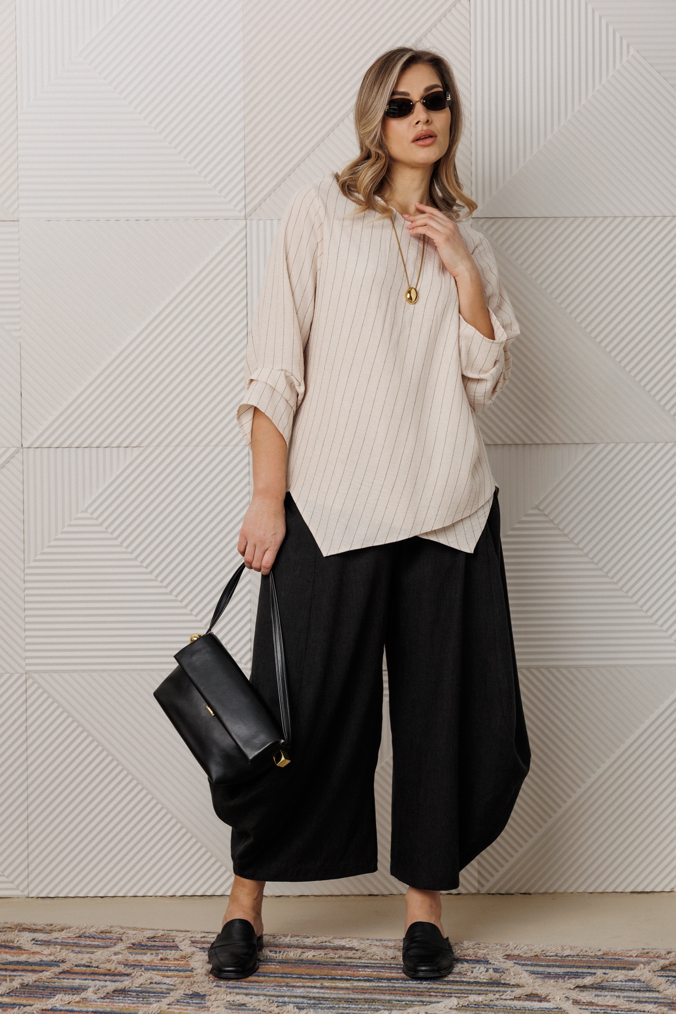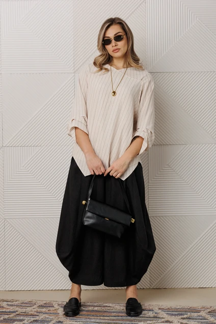 Костюм брючный 1360 Anastasia от коллекции бренда 'Анастасия' привнесет свежий акцент в ваш стильный гардероб. Комплект состоит из блузки и брюк, выполненных в стиле кэжуал, и подходит для весенне-летнего периода. Верх изделия из нежной ткани: полиэстер, вискоза, хлопок и лен, что обеспечивает комфорт и легкость. Углубленный рукав рубашечного типа и асимметричный низ добавляют оригинальности. Брюки-алладины с эластичным поясом, глубокими карманами и свободным фасоном от бедра обеспечивают максимальную свободу движений. Легкое заужение книзу делает ноги визуально стройнее. Длина по спинке составляет 78 см, длина рукава - 45 см, брюки - 95-97 см. Цветовая палитра основывается на кремовом и черно-белом оттенках, что позволяет комбинировать комплект с широким спектром обуви.
