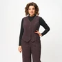 Костюм состоит из жакета и брюк. Костюм выполнен из однотонной ткани. Жакет прямого силуэта, без подкладки. Полочка жакета с вертикальными рельефами и двубортной застежкой на две пуговицы. Горловина V-образной формы. На нижней части полочки выполнены накладные карманы. Спинка со средним швом и отрезными бочками. Рукав длинный, втачной, двухшовный. Брюки со стрелками, длиной до косточки. В верхней части брюки прилегающие, в колене свободные и к низу зауженные. По передним половинам обработаны карманы, в среднем шве застежка на молнию. На задней половине обработаны талиевые вытачки. Брюки на притачном поясе с эластичной тесьмой и шлевками. Застежка по поясу на петлю и пуговицу.