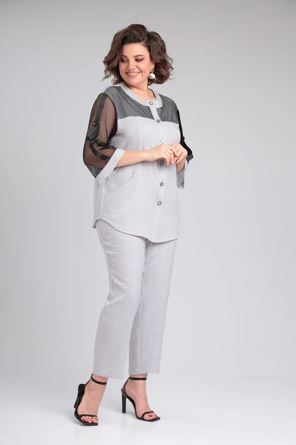 Костюм состоящий из жакета и брюк выполнен из однотонной ткани с эффектом “крэш“, в качестве отделки использовано трикотажное полотно “ сетка“. Жакет прямого силуэта. Полочка жакета с вертикальными рельефами и прорезными карманами, отрезной кокеткой с отделкой из сетки. Горловина круглой формы. Горловина и центр полочки оформлены отрезными планками с застежкой на петли и пуговицы. Спинка цельная. Пройма углубленной формы. Рукав одношовный, длиной 3/4. Рукав выполнен из сетки, по низу обработан притачной манжетой. По центру рукава выполнен декоративный элемент из репсовой тесьмы и полуколец.