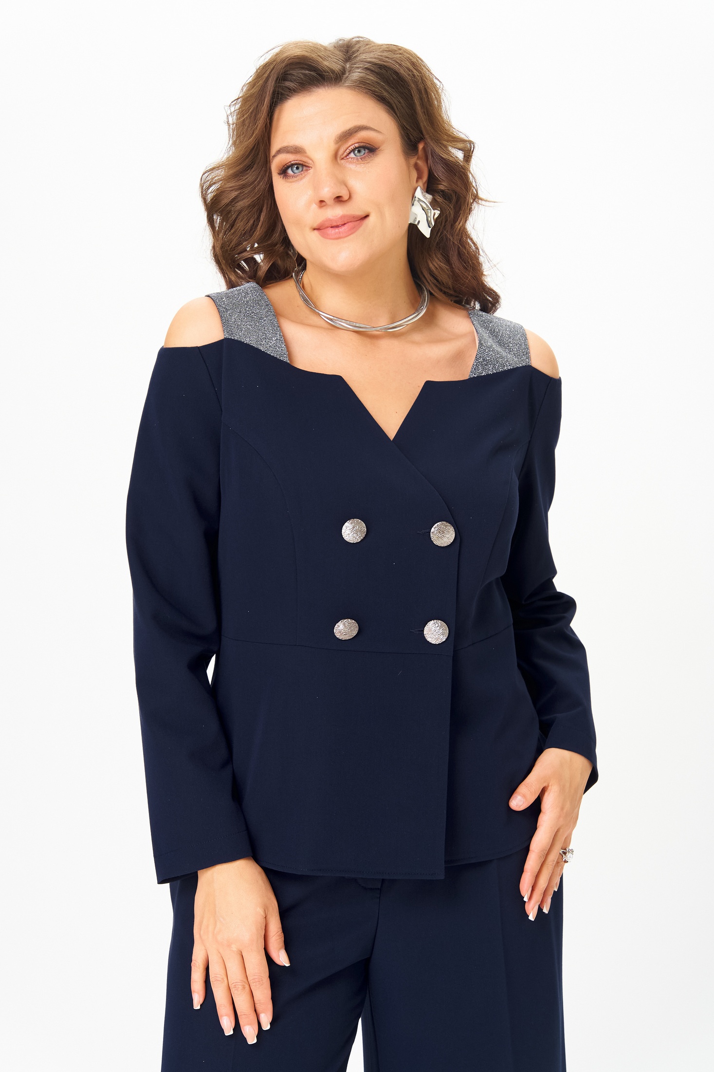 Жакет полуприлегающего силуэта, без подкладки, выполнен из костюмной однотонной ткани, в качестве отделки на бретелях использован материал с люрексом, в качестве декора использованы пуговицы сочетающиеся по цвету с бретелями.