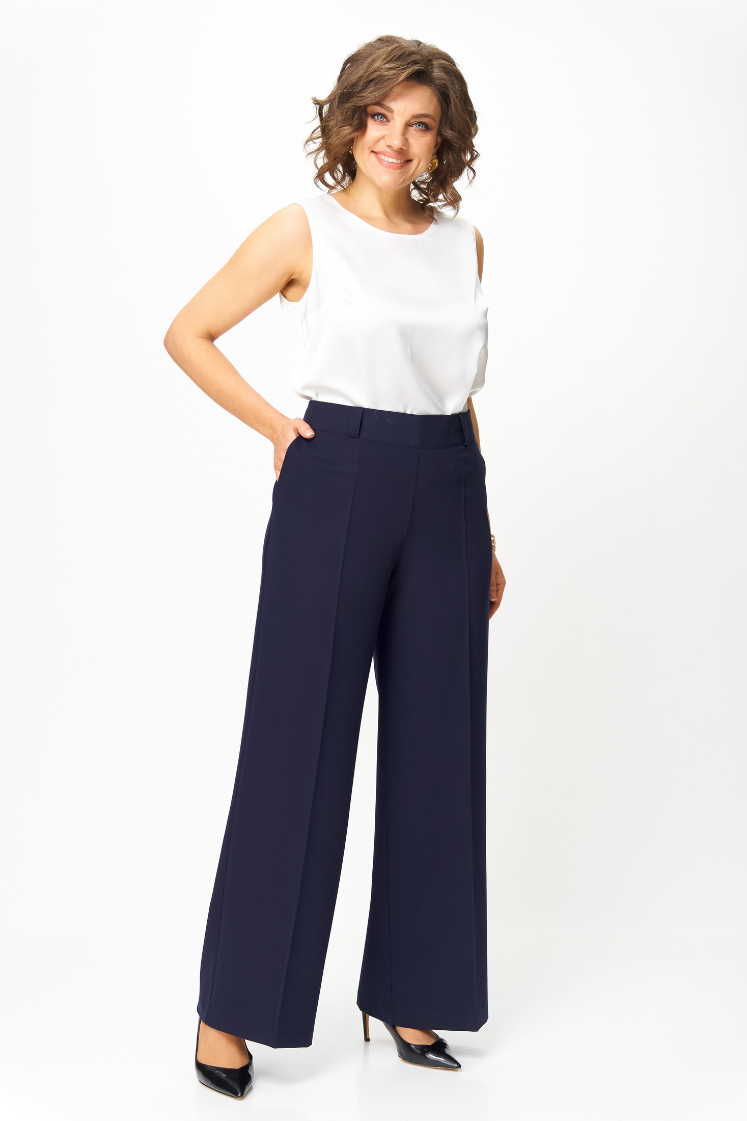 Брюки полной длины, прилегающие в области бедер и свободные в колене и по низу. Брюки со стрелками. По передним половинкам выполнены наклонные карманы. В левом боковом шве обработана застежка на потайную молнию. По талии брюки на притачной кокетке со шлевками.