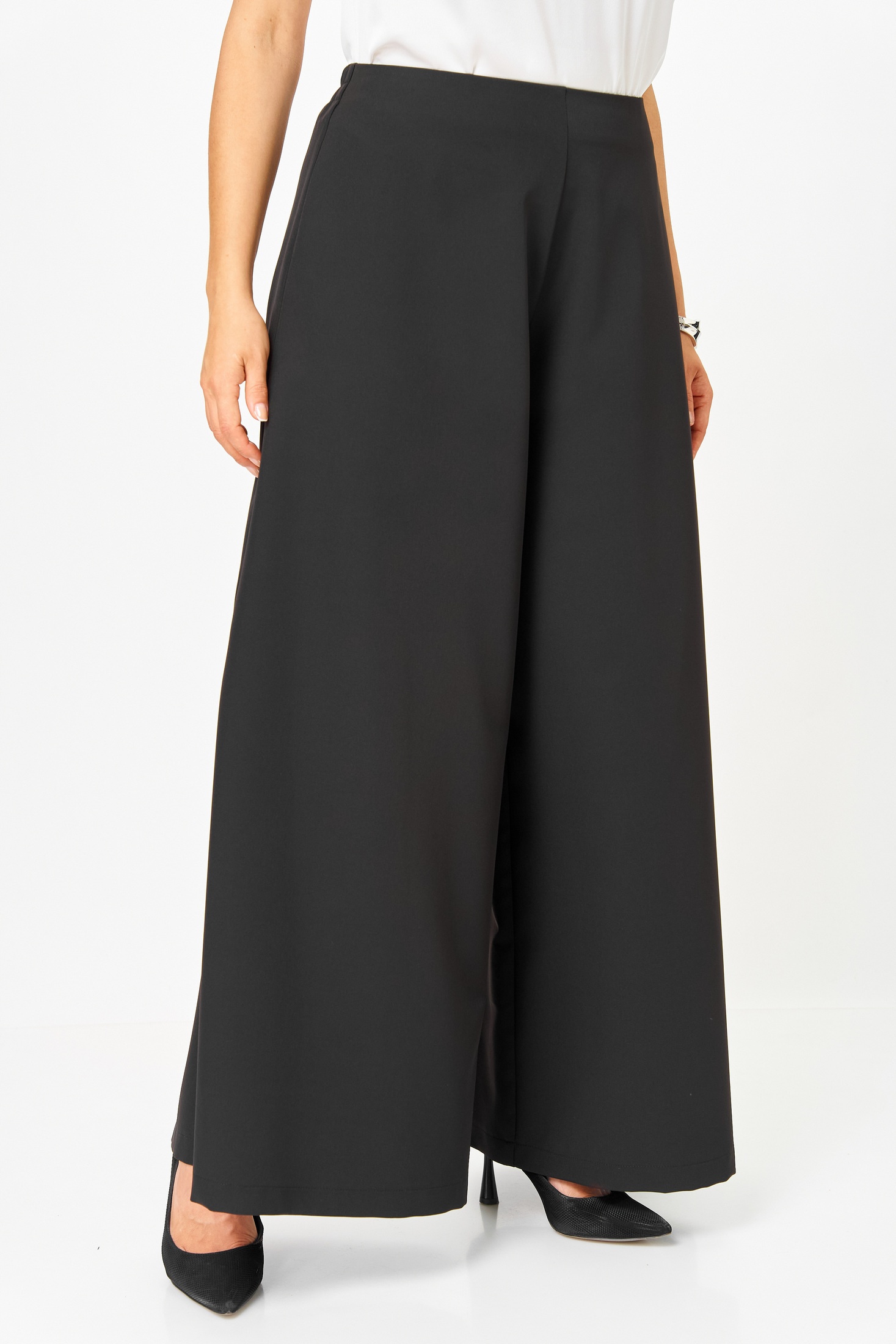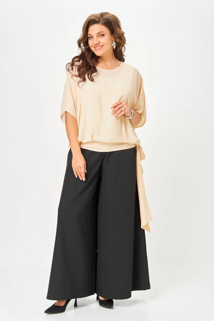 Комплект состоит из блузки топа и брюк. Блузка выполнена из однотонного креп-шифона, топ выполнен из блузочной однотонной ткани, брюки выполнены из однотонной струящейся ткани, контрастной по цвету.