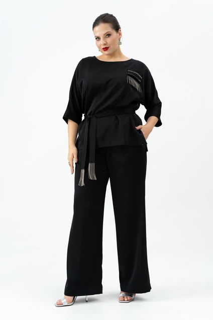 Изысканный женский брючный костюм черного цвета - идеальный выбор для любого мероприятия. Элегантная туника прямого силуэта с уникальными нагрудными вытачками и декоративным карманом, украшенным сверкающими фрагментами. Боковые разрезы добавляют комфорта и изящества силуэту. К тунике идеально дополняют ансамбль прямые брюки с комфортным поясом на резинке по спинке и притачным поясом спереди. Практичность и стиль подчеркиваются за счет карманов, вшитых в передние швы. Этот костюм не только подчеркнет ваш изысканный вкус, но и обеспечит удобство на протяжении всего дня.