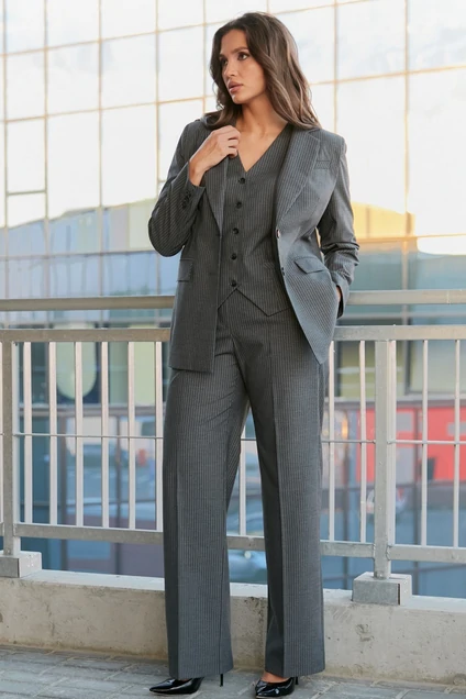 Костюм женский трех предметный, состоящий из жакета, жилета и брюк. Жакет полуприлегающего силуэта с центральной застежкой на петли и пуговицы, с пиджачным воротником, с втачными рукавами. Перед с нагрудными вытачками, отрезными бочками, прорезными карманами «в рамку» с клапаном и нагрудным карманом с листочкой. Спинка с отрезными бочками и средним швом. Рукава двухшовные со шлицей.