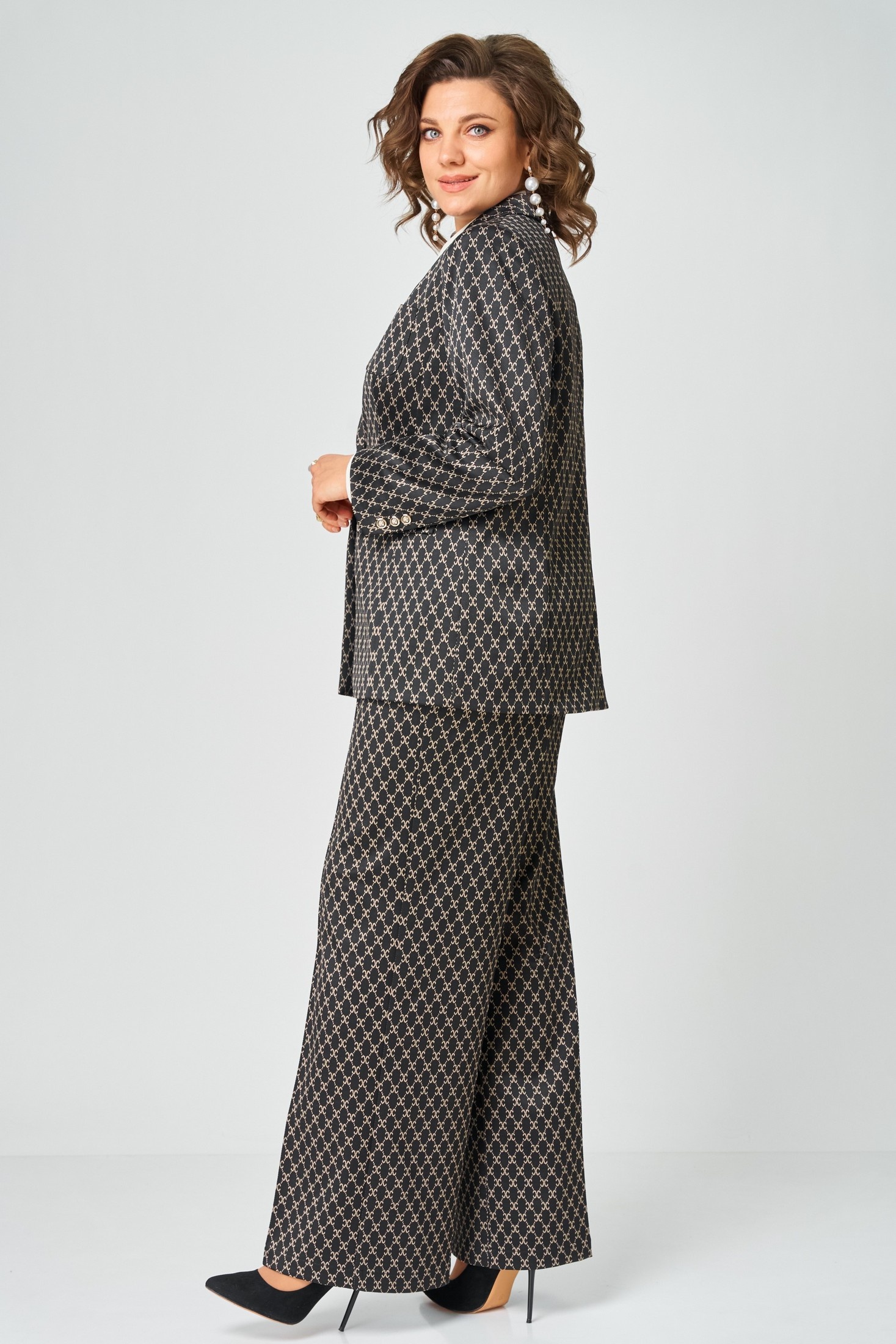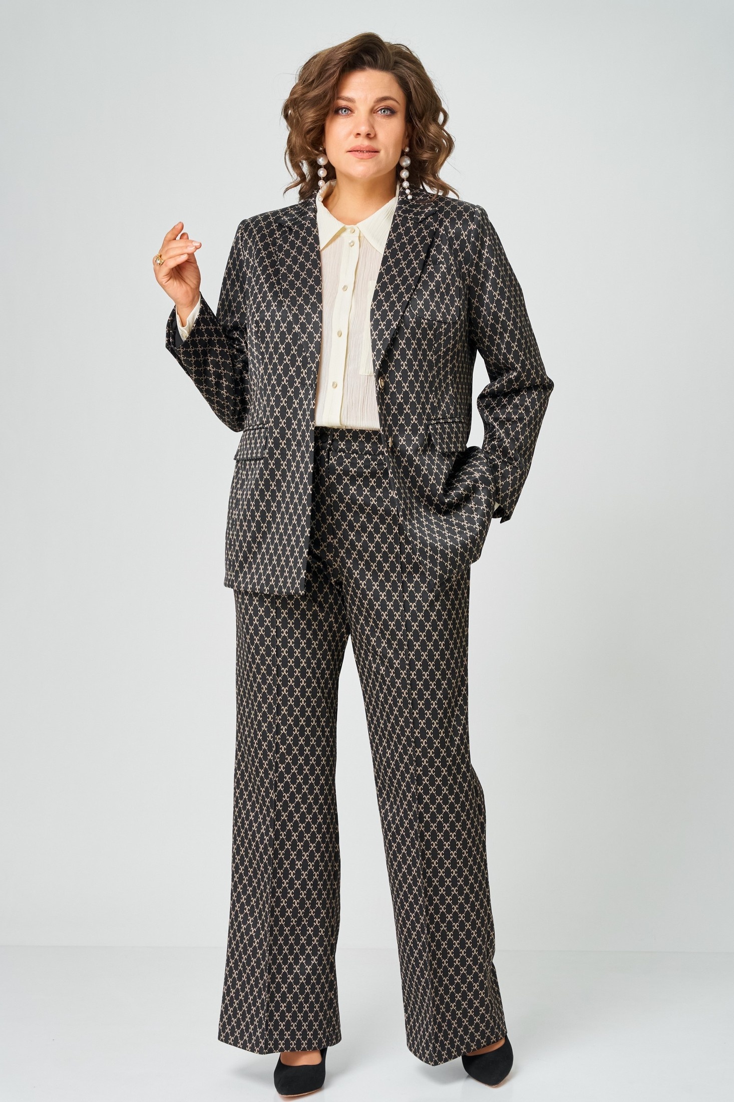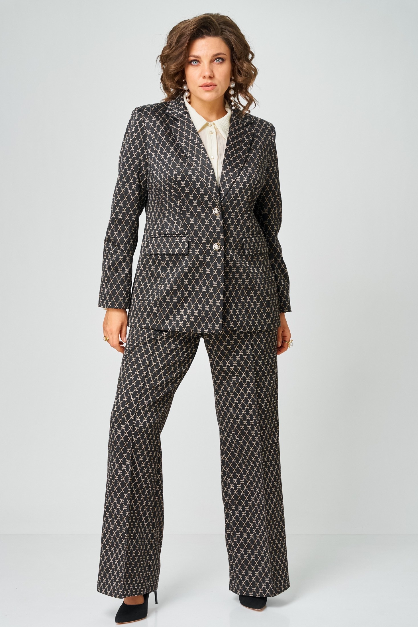 Костюм брючный 9085-26 ANDINA CITY предлагает идеальное сочетание комфорта и стиля. Коллекция бренда ANDINA CITY выполнена из эластичного материала, содержащего полиэстер, вискозу и спандекс, что обеспечивает комфорт и свободное движение в течение всего дня. Жакет с пиджачным воротником и лацканами, застёжкой на пуговицы и прорезными карманами с клапанами подчеркнёт статусный классический образ. Свободные брюки палаццо, дополненные резинкой по поясу, гармонично дополняют костюм, позволяя создать стильный повседневный комплект для офиса или прогулок. Чёрно-белая цветовая гамма и геометрический рисунок добавляют изысканности и универсальности, идеально подчеркивая любой силуэт. Этот костюм станет отличным выбором для демисезонного гардероба.