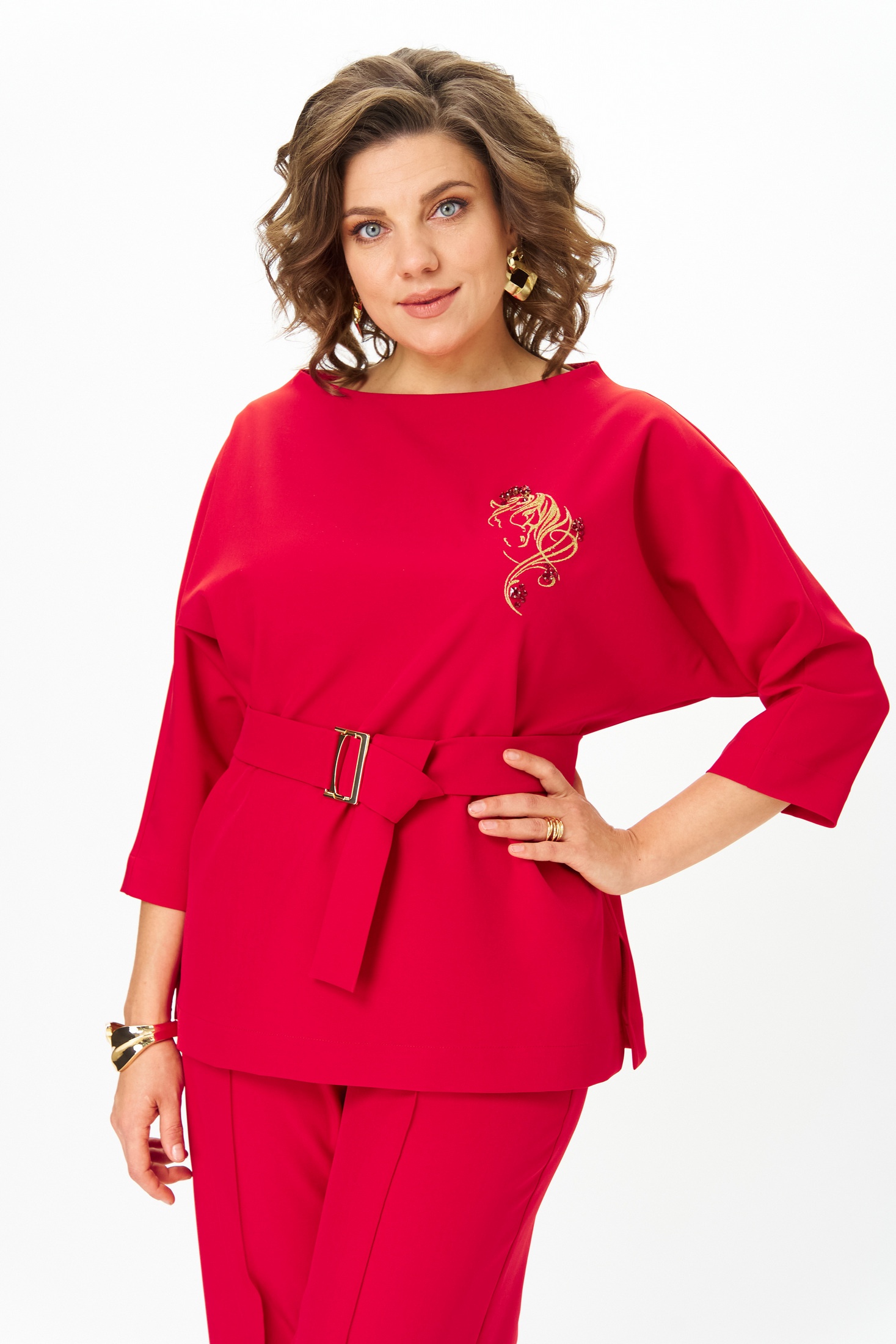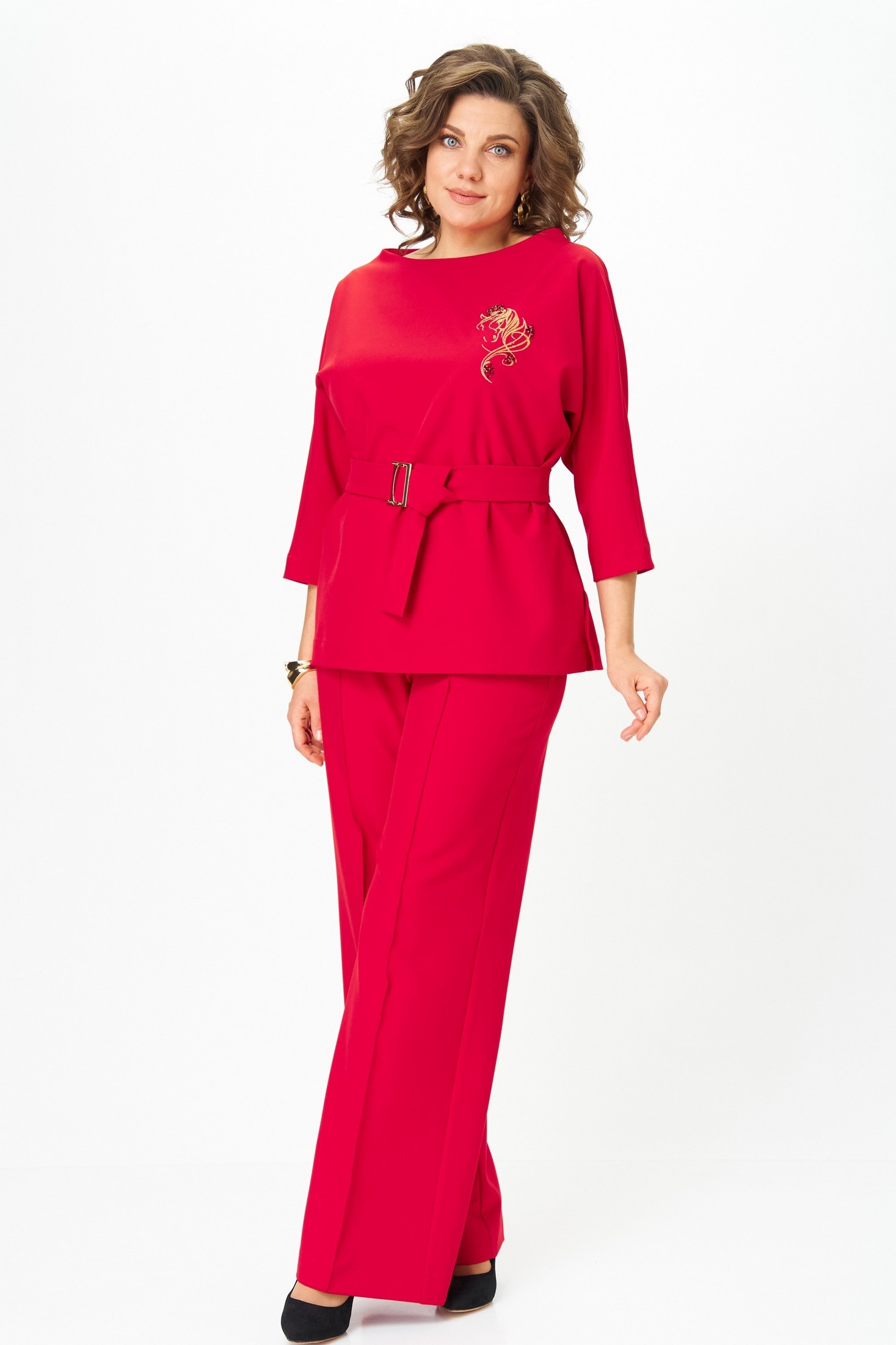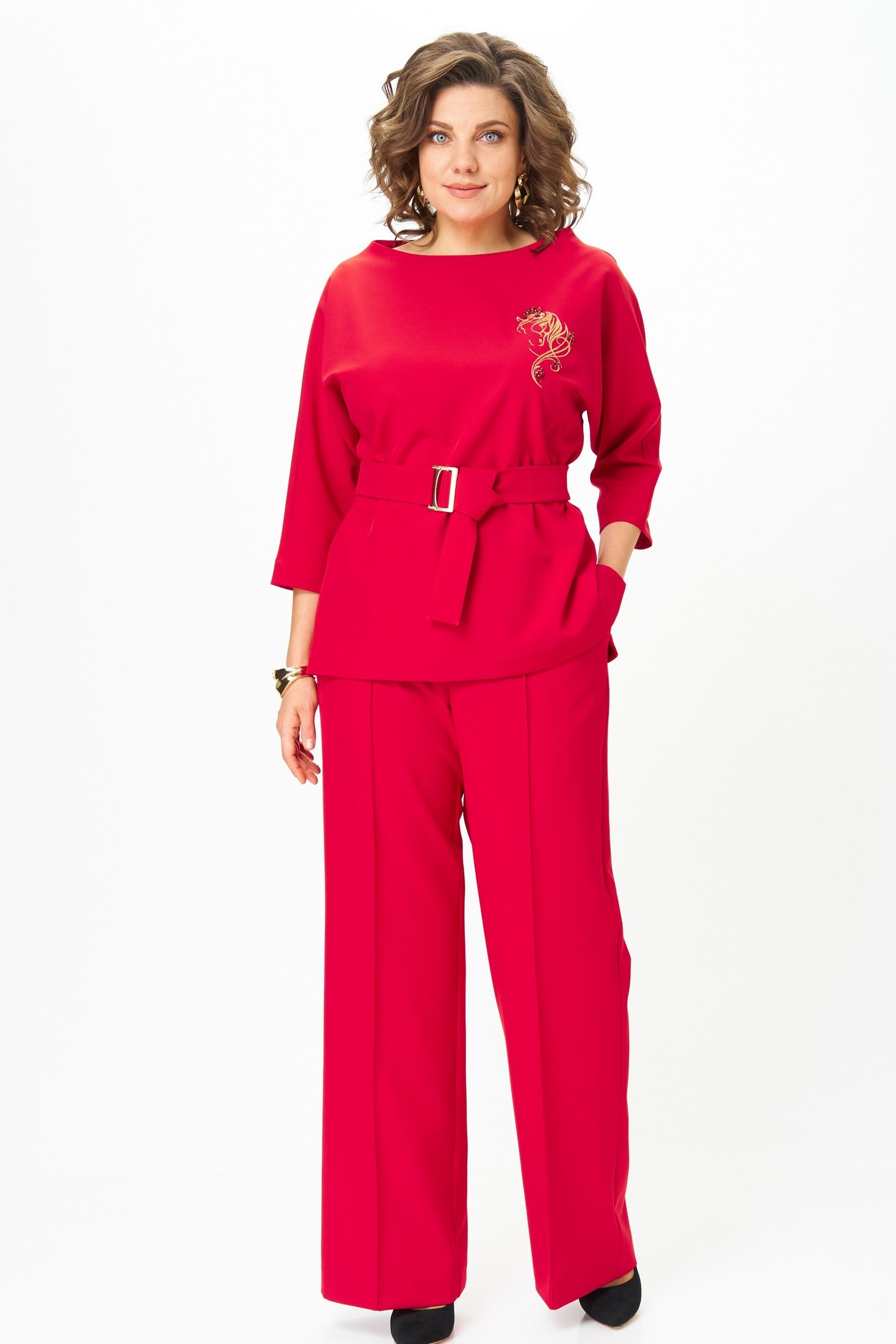 Костюм брючный 9091-25 красный ANDINA CITY. Коллекция бренда ANDINA CITY предлагает стильный и комфортный выбор для вашего гардероба. Костюм состоит из блузки прямого кроя с модным 3/4 рукавом и съемным поясом, а также брюк палаццо с широкими штанинами и боковыми карманами. Выполнен из практичного полиэстера с добавлением спандекса, что обеспечивает комфорт и удобство в носке. Красный цвет привносит яркость и женственность в повседневный образ, а вышивка добавляет нежности. Идеально подходит для весенне-летнего сезона благодаря легкому, но стильному дизайну. Этот комплект универсален и будет актуален как в офисе, так и на прогулках.