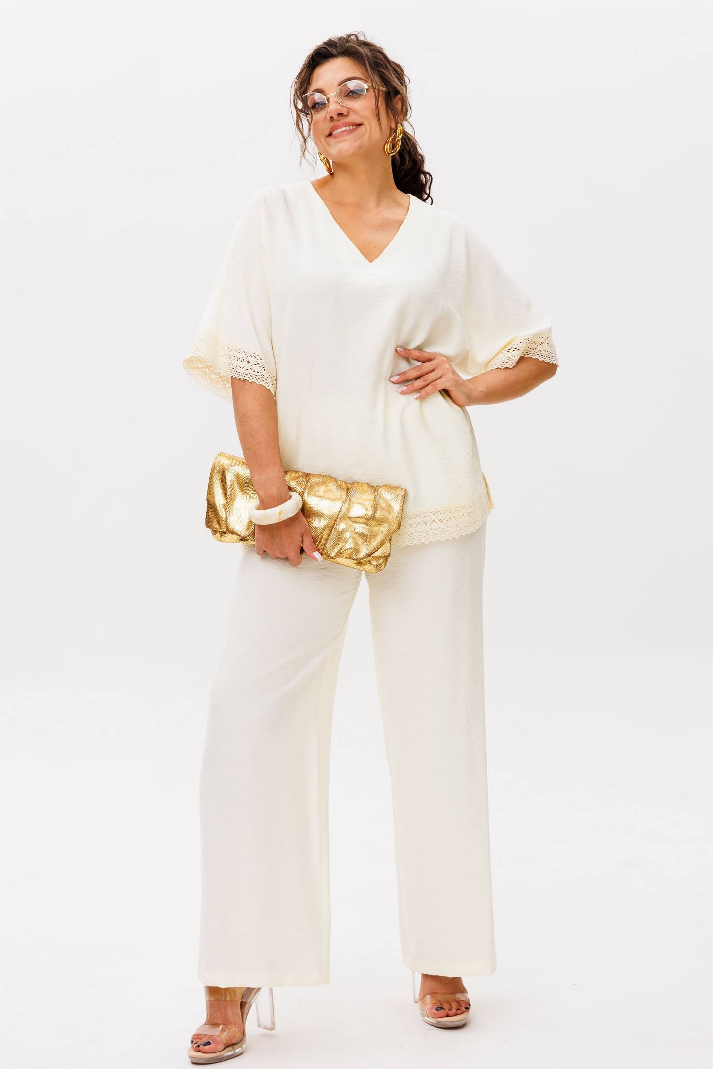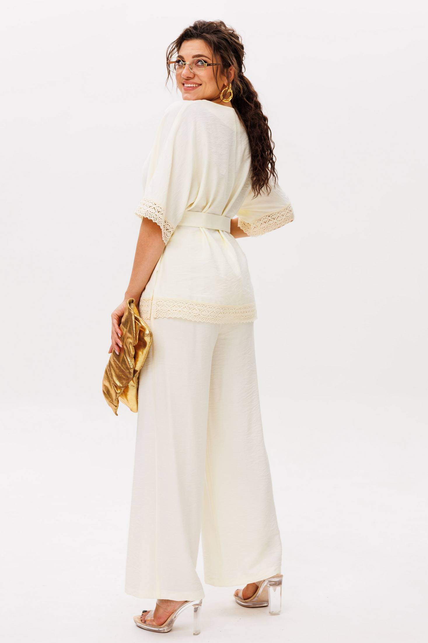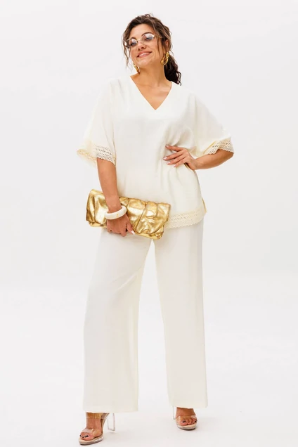 Костюм брючный 1607 ванильный пломбир Anelli сочетает в себе комфорт и женственность. Коллекция бренда Анелли предлагает уникальный ансамбль в цвете «ванильный пломбир», сшитый из мягкой вискозы. Свободная блуза с глубоким V-образным вырезом и цельнокроеными рукавами длиной ¾ украшена изысканным кружевом. Брюки-палаццо свободного кроя оснащены комфортным поясом на резинке и вместительными карманами, что придаёт свободу движениям. Лёгкие разрезы по бокам и возможность подчеркнуть талию поясом делают этот костюм стильным выбором для летних прогулок или арт-бранча. Носите комплект целиком или комбинируйте его элементы для создания различных образов, погружаясь в атмосферу городского шика.