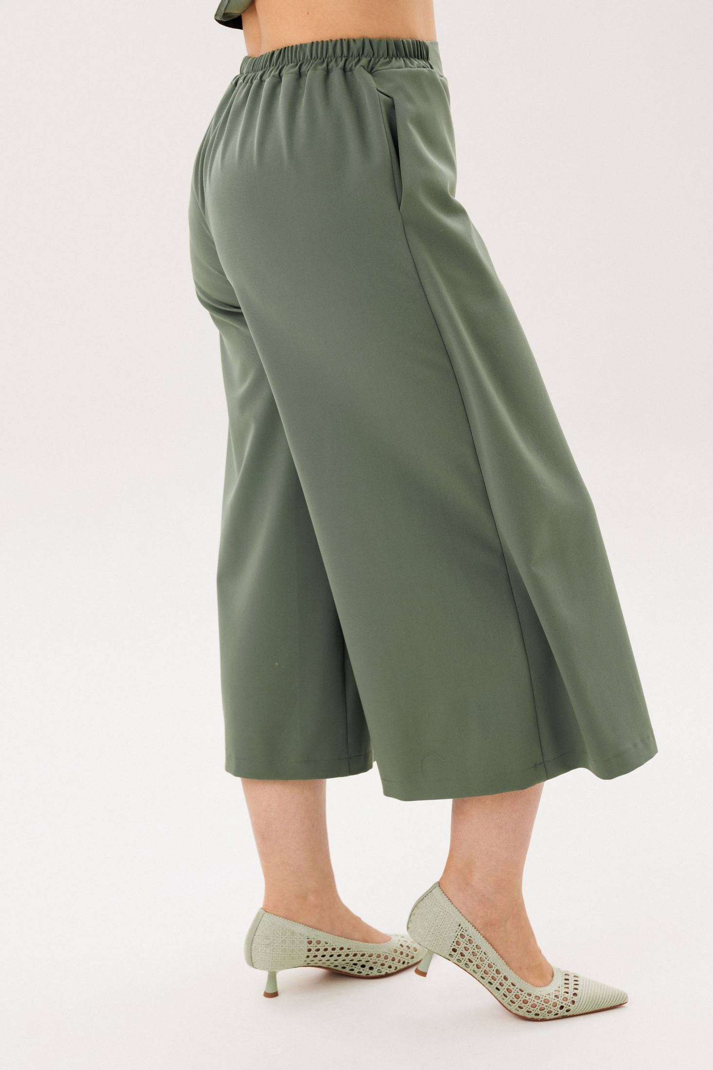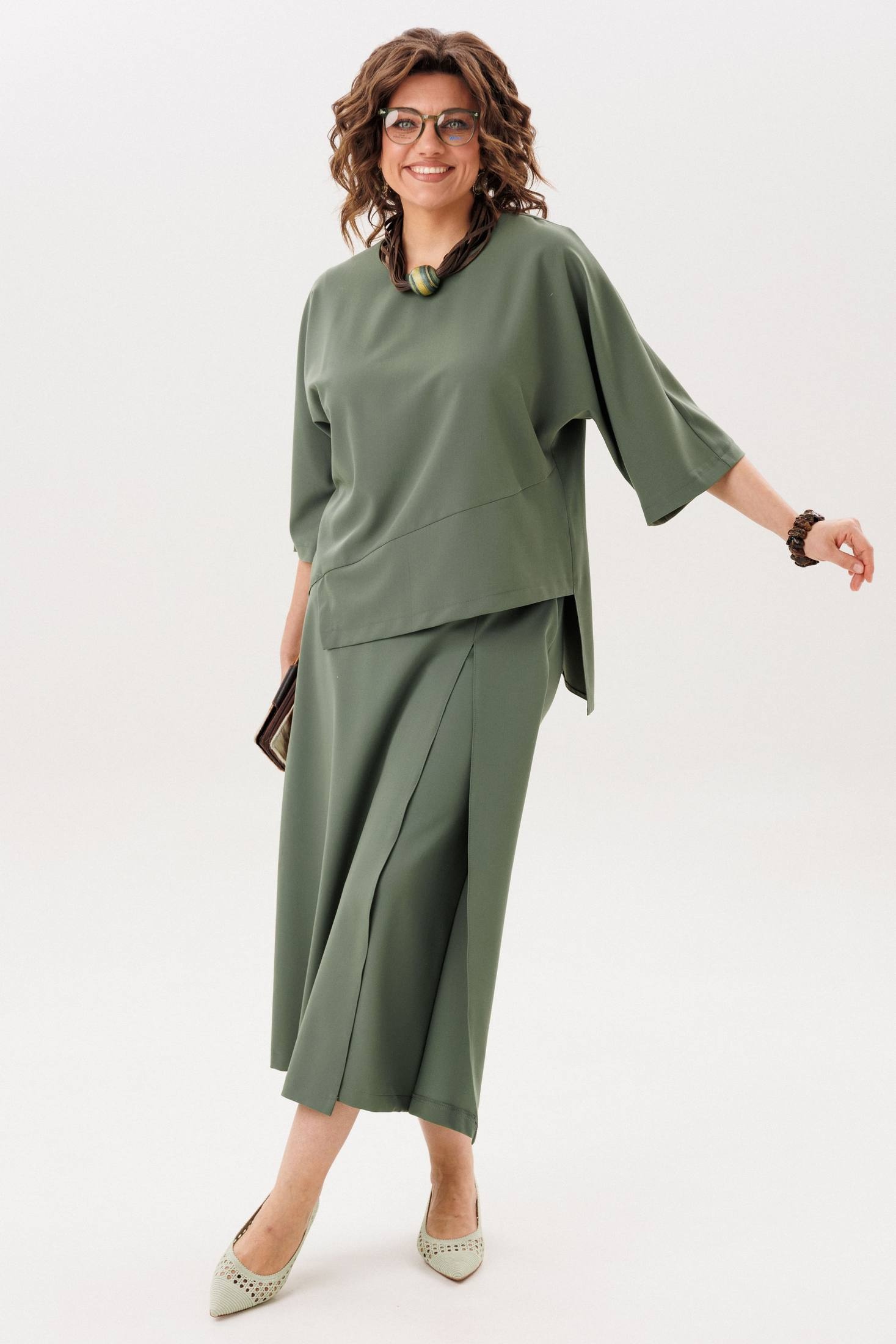 Костюм брючный 1793-2 зеленый холм Anelli привносит в ваш гардероб уникальное сочетание строгого силуэта и нежной динамики. Коллекция бренда Anelli использует высококачественную вискозу и полиэстер, обеспечивая комфорт и лёгкость. Блузон с цельнокроеными рукавами и фигурным низом создаёт элегантный образ, дополняемый юбкой-брюками-кюлотами с высокой талией и скрытыми карманами. Идеально подходит для весенне-летнего сезона и может стать частью как делового, так и повседневного образа. Универсальный цвет "зеленый холм" добавляет свежести вашему стилю. Длина блузона составляет 66-71 см в зависимости от размера.