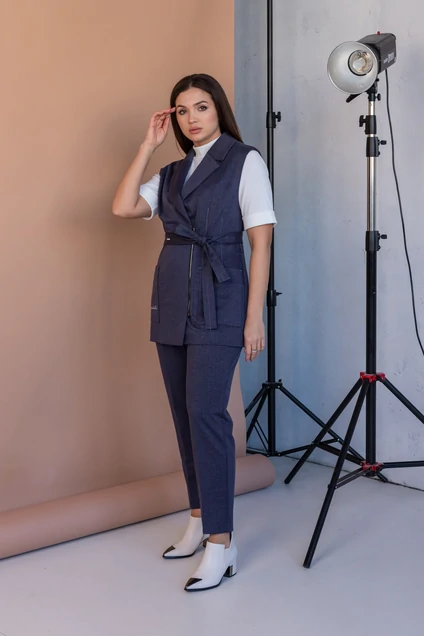 Комплект женский состоит из жилета, блузки и брюк.
