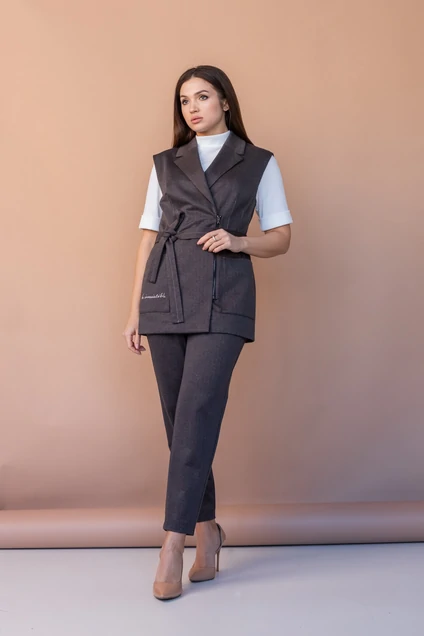 Комплект женский состоит из жилета, блузки и брюк.