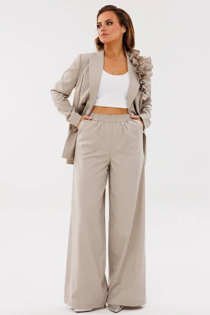 Широкие брюки с высокой посадкой, с поясом на резинке. В боковых швах имеются функциональные наклонные карманы. Длина жакета: 72 см