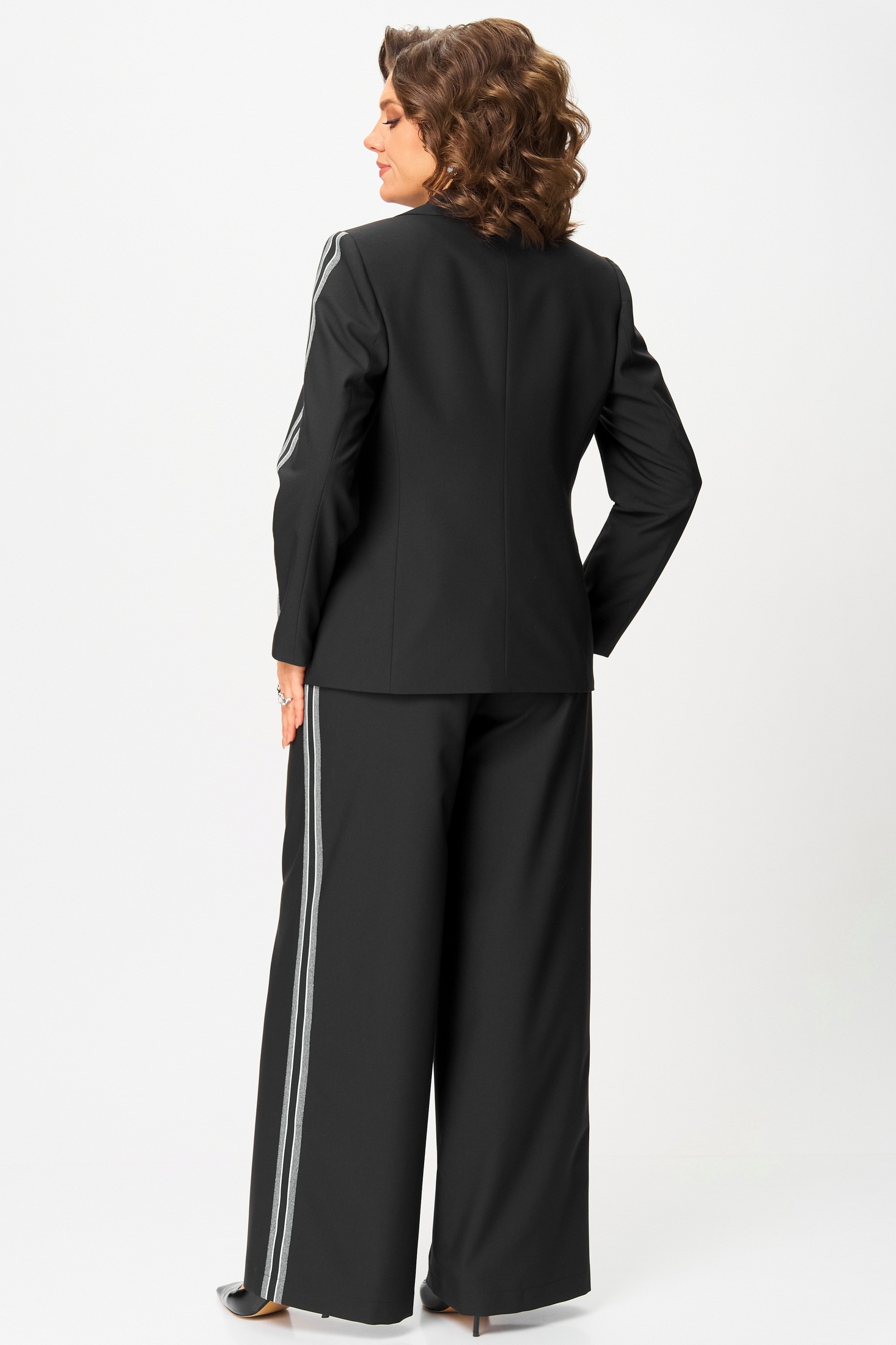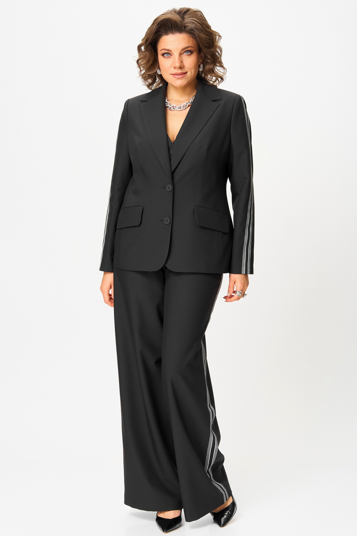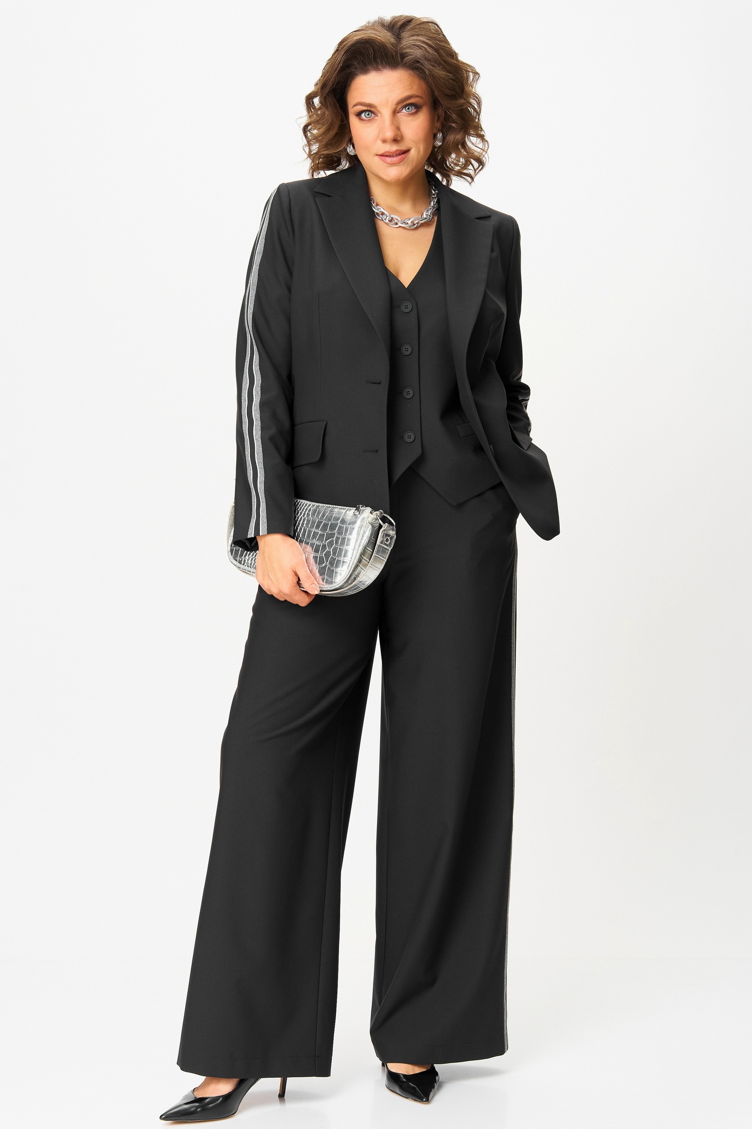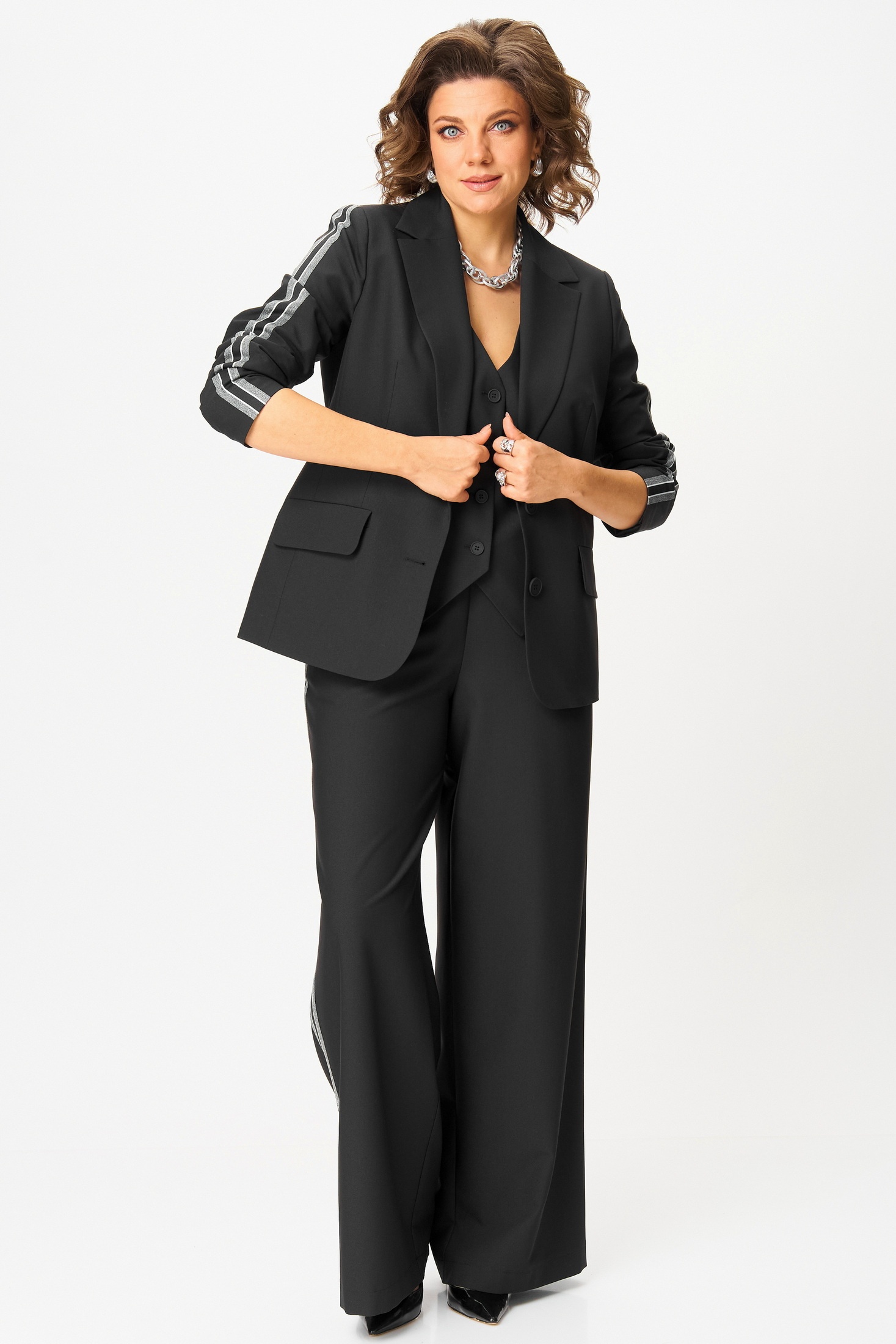 Костюм брючный 1300 Angelina&Company сочетает в себе стиль и комфорт. Коллекция бренда Angelina&Company предлагает этот комплект-тройку с широкими брюками, который придаёт образу строгости и утончённости. Изготовленный из сочетания полиэстера и вискозы, костюм дарит приятное ощущение и практичность. Однобортный жакет полуприталенного силуэта с подкладкой имеет отложные лацканы и прорезные карманы, добавляющие функциональность. В жакете длиной 65 см рукава с лампасами и застёжка на пуговицах. Жилет с V-образным вырезом длиной 52 см также имеет карманы с листочкой. Широкие брюки длиной 114 см с высокой посадкой и поясом на резинке дополняют комплект. Идеально подходит для офисных будней и повседневного использования в осенне-зимний сезон. Цвет костюма — универсальный чёрный.