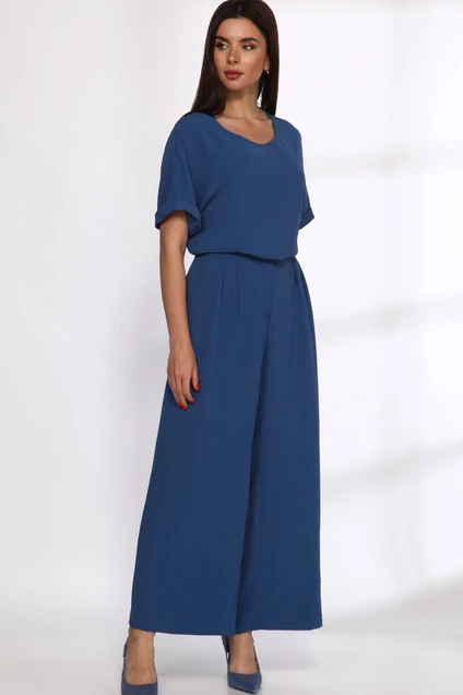 Костюм женский, состоящий из блузки и брюк. Блузка свободного силуэта с цельнокроеным рукавом. Низ рукава с манжетой. Горловина округлой формы обработана окантовкой. На спинке блузки расположена застежка. Классические брюки расклешенные книзу. По переду брюк симметричные мягкие складки. В боковых швах расположены карманы "хулиганы". Брюки с поясом.
