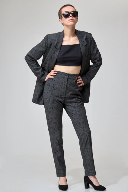 Деловой комплект из костюмной ткани с декоративным рисунком состоит из жакета оверсайз и классических брюк. Отлично подойдёт для офиса и повседневной носки, для прогулок и дружеских встреч.