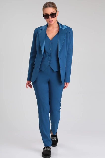 Классический комплект-тройка, состоящий из жакета, жилета и брюк, подчеркнет Вашу элегантность и женственность. Подойдет к деловому образу для офиса, учебы и работы. Однобортный жакет полуприталенного силуэта, на подкладке, с плечевыми накладками. Воротник пиджачного типа с отложными лацканами. По переду центральная застежка на петли и пуговицы и прорезные карманы с клапаном, талиевые вытачки и рельефы. Низ бортов закругленной формы. Спинка со средним швом и рельефами. Рукав втачной двухшовный длинный. Жилет прилегающего силуэта с центральной бортовой застежкой на петли и пуговицы, на подкладке. Вырез горловины V-образной формы. Перед - с талиевыми вытачками и прорезными карманами с листочкой. Спинка со средним швом и талиевыми вытачками. Брюки с высокой посадкой, слегка заужены книзу. Притачной пояс со шлевками и застежкой на молнию и пуговицу, по боковым - вставка из эластичной тесьмы. На задних половинках - вытачки. В боковых швах расположены функциональные косые карманы. Длина жакета: 65 см