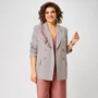 Брюки с высокой посадкой, слегка заужены книзу. Притачной пояс со шлевками и застежкой на молнию и пуговицу, по боковым - вставка из эластичной тесьмы. На задних половинках - вытачки. В боковых швах расположены функциональные косые карманы. Длина жакета: 66 см