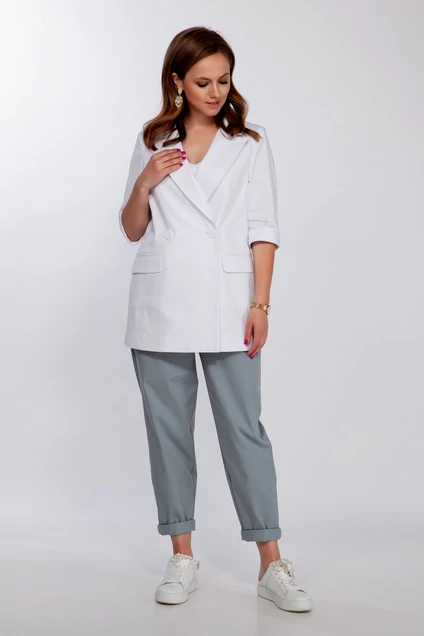 Комплект женский двухпредметный. Жакет двубортный с карманом «в рамку» и клапаном. Перед жакета на подкладке. По рукаву притачная, отложная манжета. Двубортная застежка на две петли и пуговицы. Брюки с высокой посадкой и карманами. Пояс на резинке. Низ брюк на манжете. жакет- 72% хлопок, 26% Полиэстер, 2% эластан.
