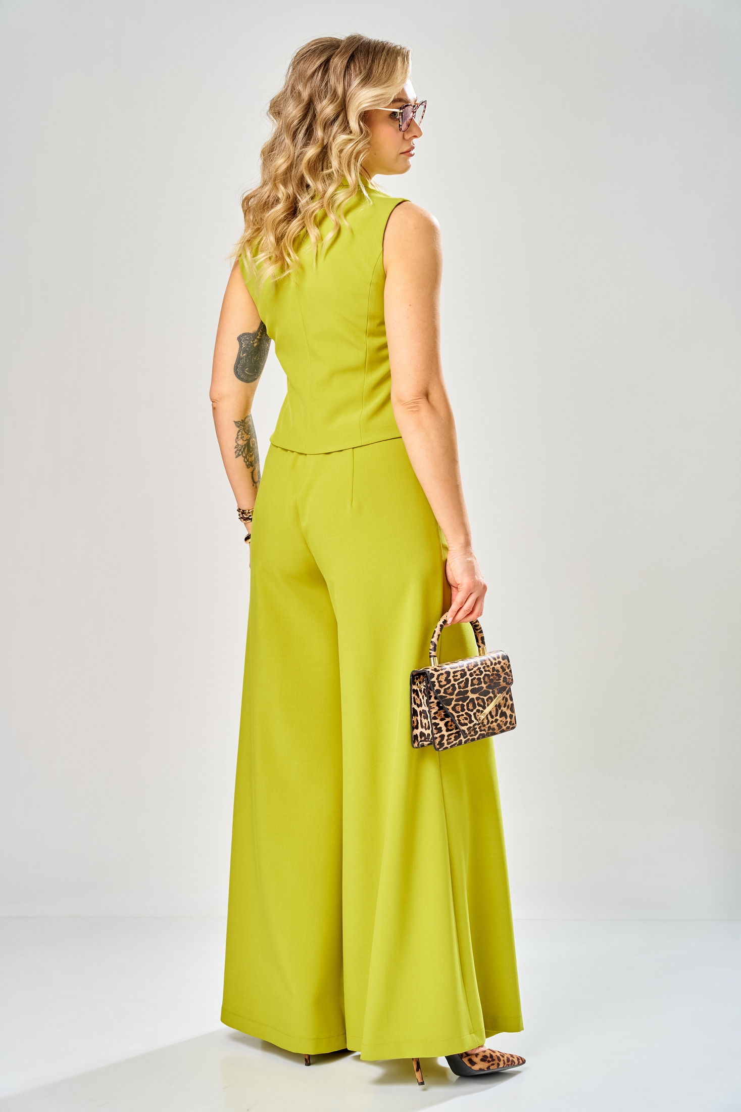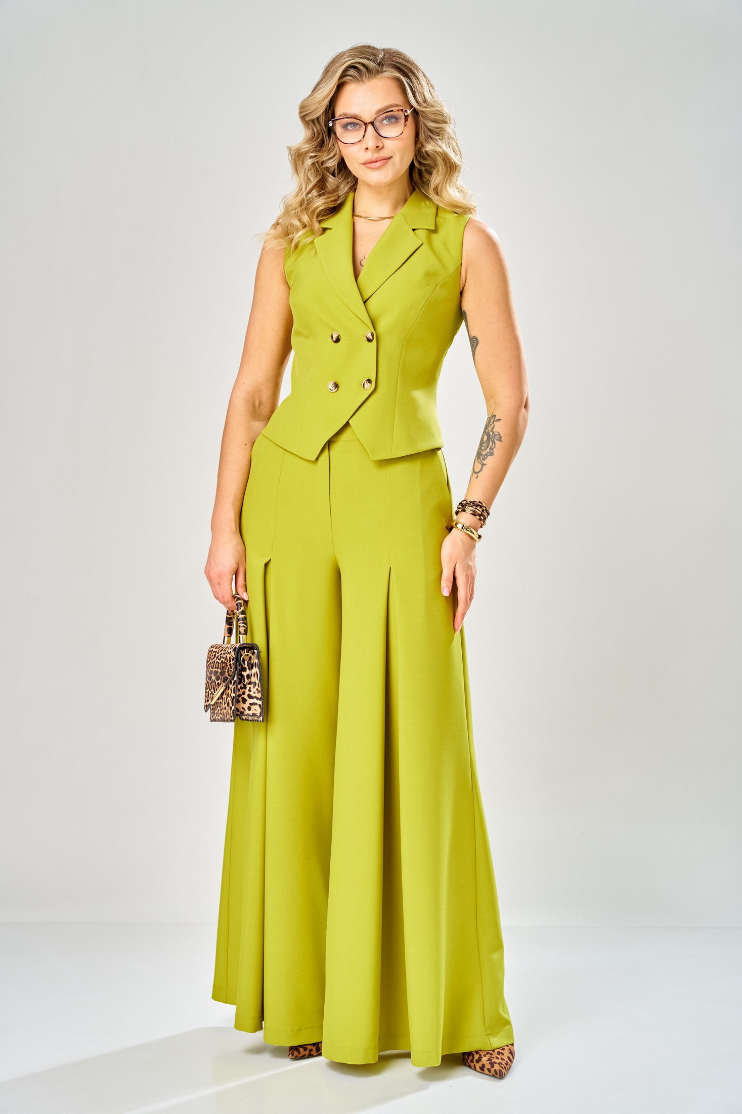 Костюм брючный 1011 лайм ARTELLA — это идеальный выбор для стильных и уверенных в себе женщин. Коллекция бренда ARTELLA представляет комплект, состоящий из укороченного жилета и брюк-палаццо. Изготовлен из полиэстера с добавлением вискозы и спандекса, костюм обеспечивает комфорт и свободу движений. Жилет украшен двубортной застежкой и лацканами пиджачного типа, что придает образу деловой стиль. Брюки прямого силуэта с застежкой на молнию и эластичной тесьмой в поясной части обеспечивают идеальную посадку. Лаймовый цвет модели добавит яркости в ваш гардероб, а косые карманы и бантовые складки подчеркивают её уникальность. Идеален для весны и лета, этот костюм подходит для повседневных и деловых встреч. Длина жилета по спинке р.46-50 - 50 см, рр.52,54 – 53 см, длина брюк 115 см.