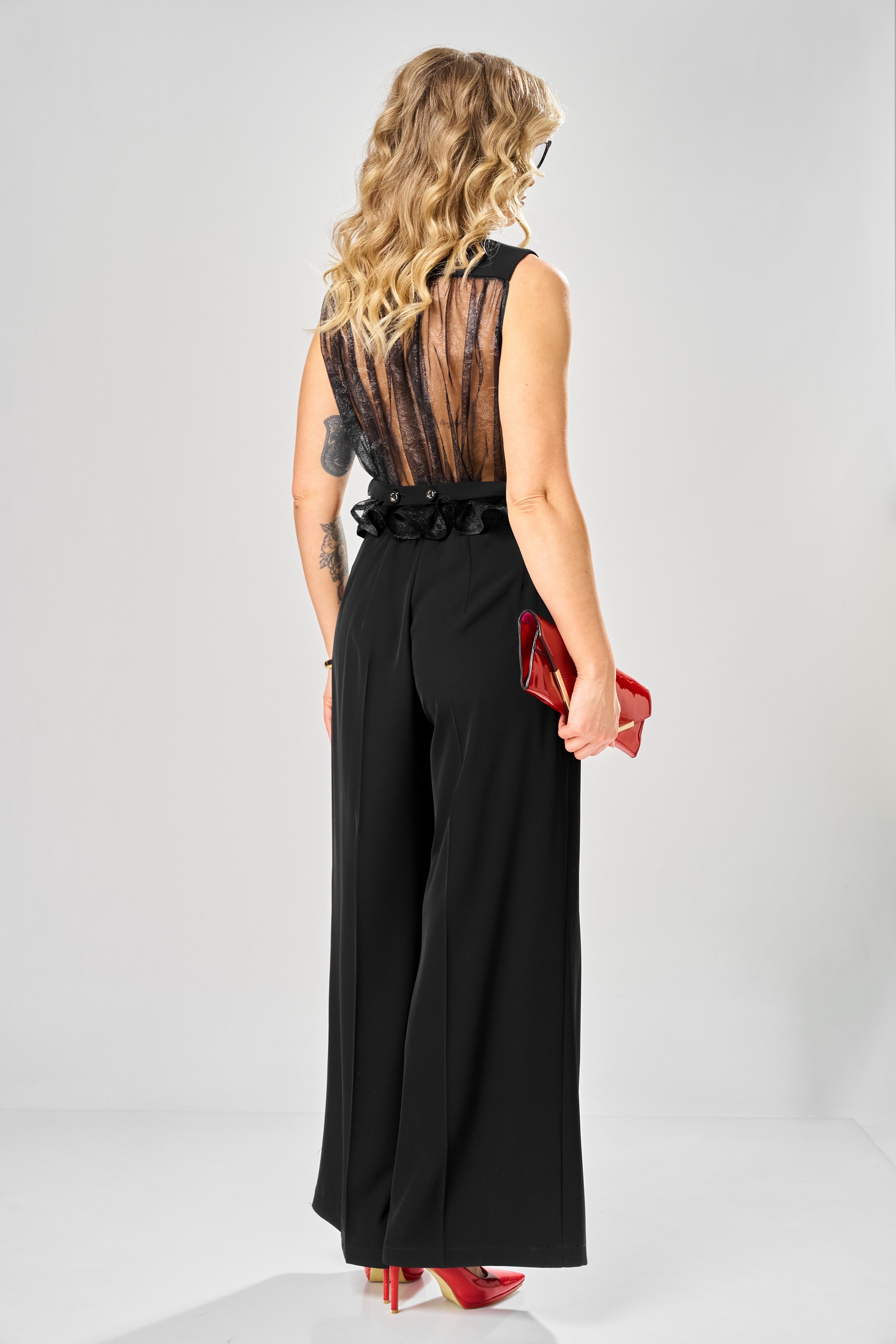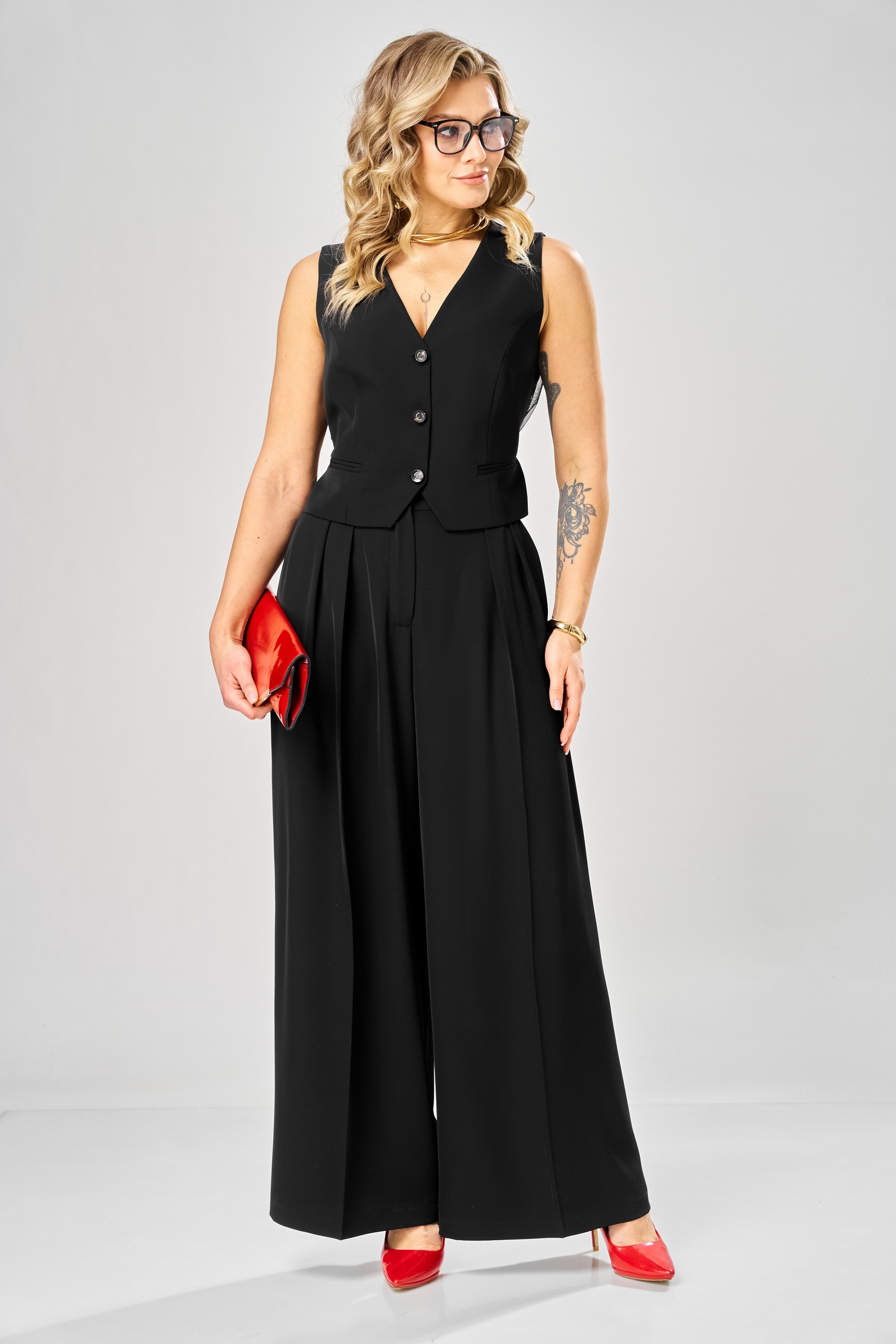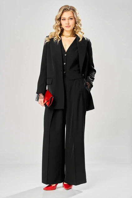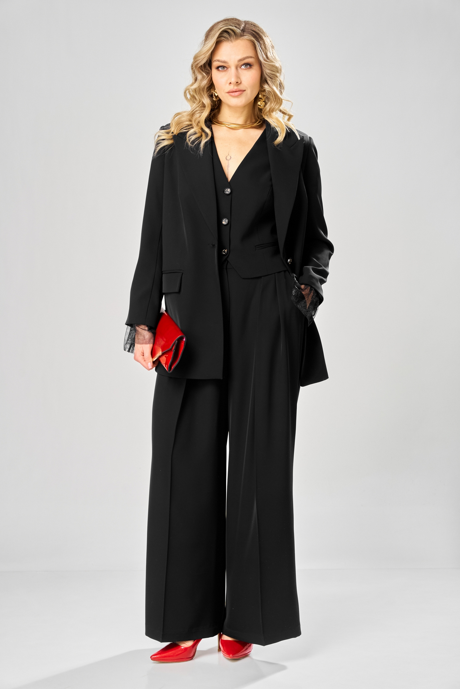 Костюм брючный 1028 черный ARTELLA — это воплощение изысканного офисного стиля. Коллекция бренда ARTELLA предлагает комплект, состоящий из брюк, жакета и жилета, выполненных из текстильной ткани, состоящей из 97% полиэстера и 3% эластана. Брюки-палаццо создают классический и строгий силуэт благодаря прямому крою и эластичному поясу. Жакет длиной 78 см с втачными рукавами и пиджачным воротником подчёркивает деловой стиль. Жилет с фигурным низом и кружевной отделкой придаёт образу уникальную свежесть. Цвет чёрный, подходит для всех сезонов, создавая стильный образ для офисных и торжественных мероприятий. Длинные элементы, такие как рукав 61 см и брюки 112 см, идеальны для комфортной посадки.