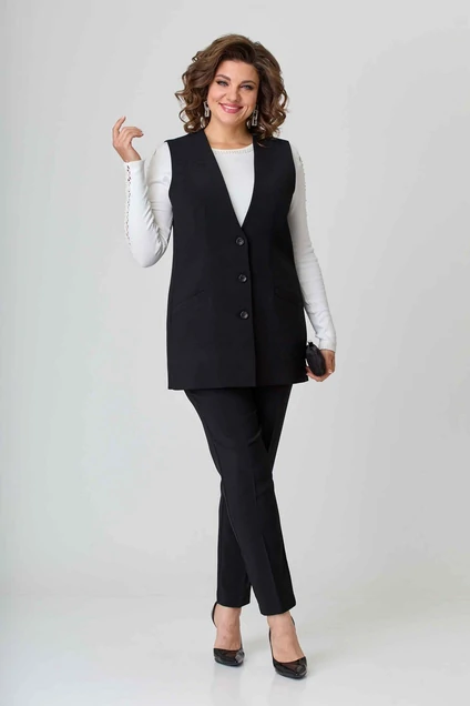 Костюм женский двойка (жилет, брюки) полуприлегающего силуэта из костюмной стрейчевой ткани. Жилет с центральной застежкой на пуговицы. По переду рельефы переходящие в косые карманы с листочками. В области бокового шва переходной бочок. Спинка с центральным швом. Вырез горловины V – образный. Брюки классические зауженные к низу. Пояс со шлевками. Застежка на гульфик на тесьму-молнию. Длина изделия жилет: 77 (±1) см. Длина изделия брюки: 100 (±2) см.