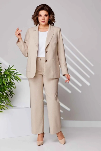 Костюм женский полуприлегающего силуэта из костюмной ткани. Жакет с длинным двухшовным рукавом, воротник пиджачного типа, застежка центральная по переду. Карманы накладные. Спинка свободная. Изделие на подкладке. Брюки классические на поясе с резинкой. Вверху карманы в боковых швах.
