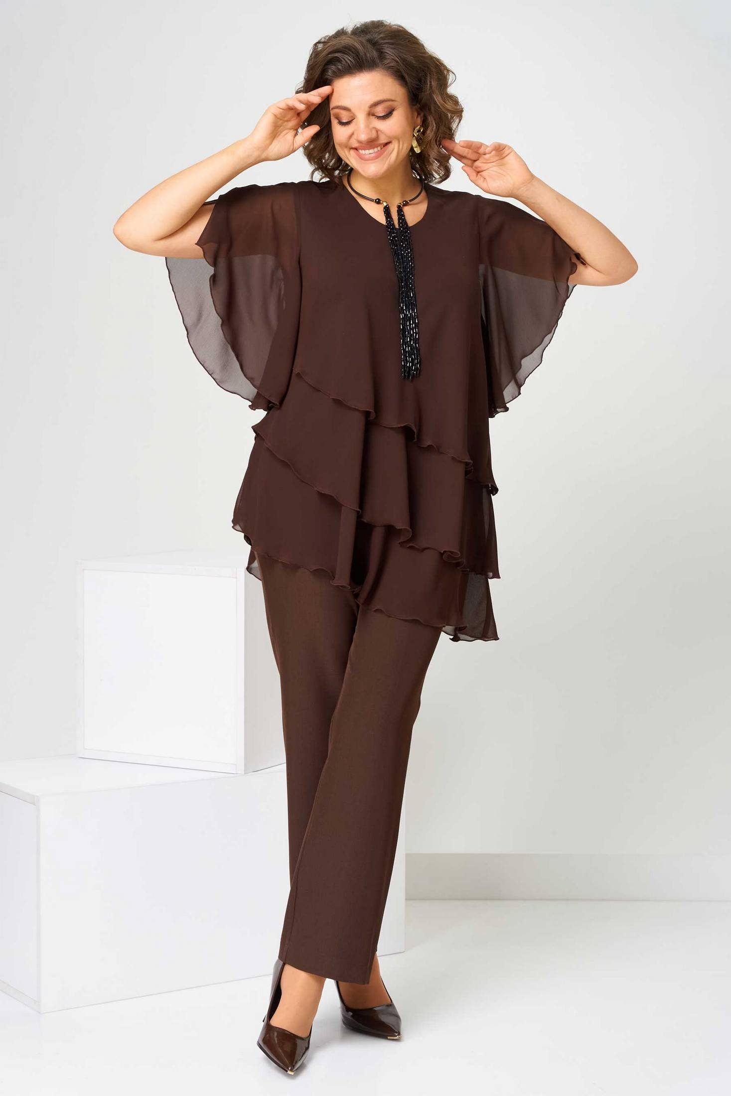 Костюм брючный (двойка) женский свободного силуэта, состоит из блузки и брюк. Блузка с рукавом 3/4 с разрезом и фигурным низом. Изделие (блузка) трехслойное, все слои с асимметричным низом. Застежка-капелька на спинке. Брюки немного расширены к низу, на поясе с резинкой. Застежка на гульфик, на тесьму-молнию.