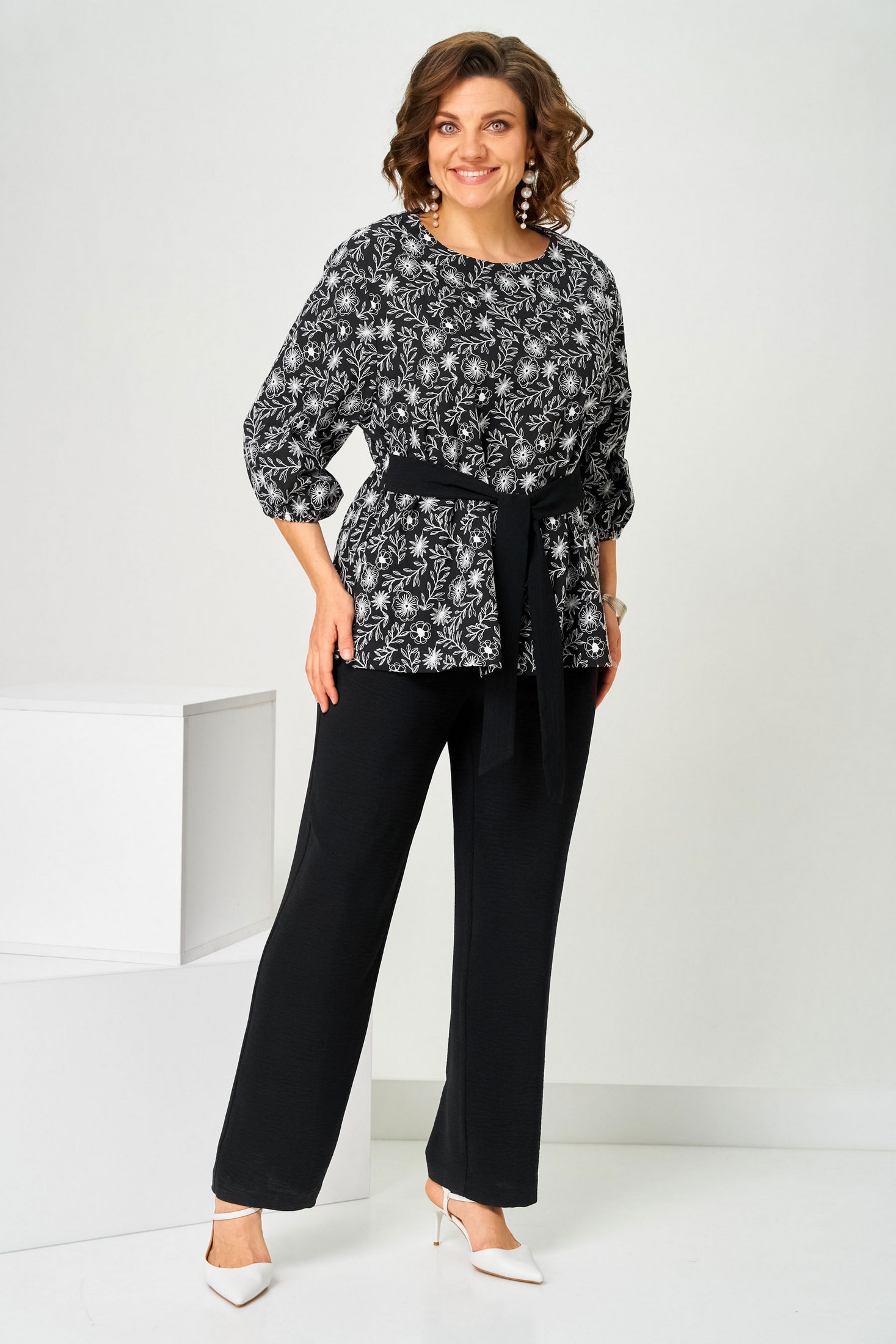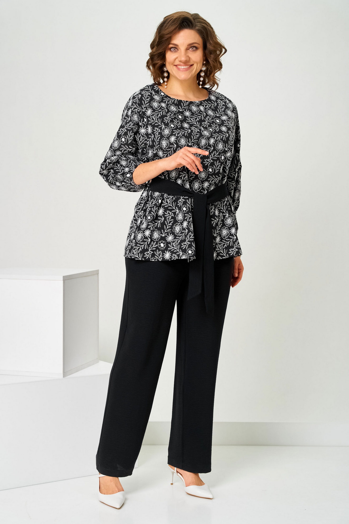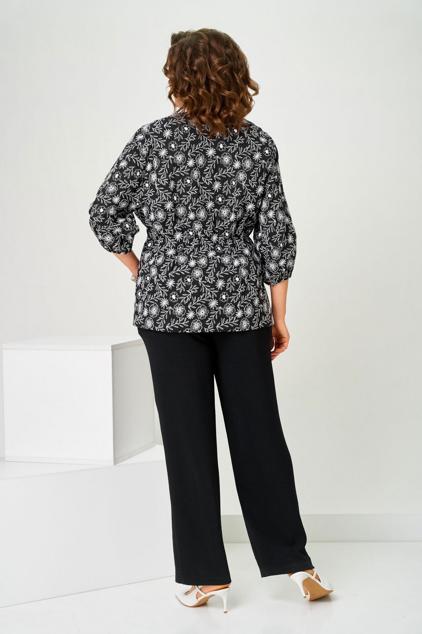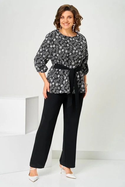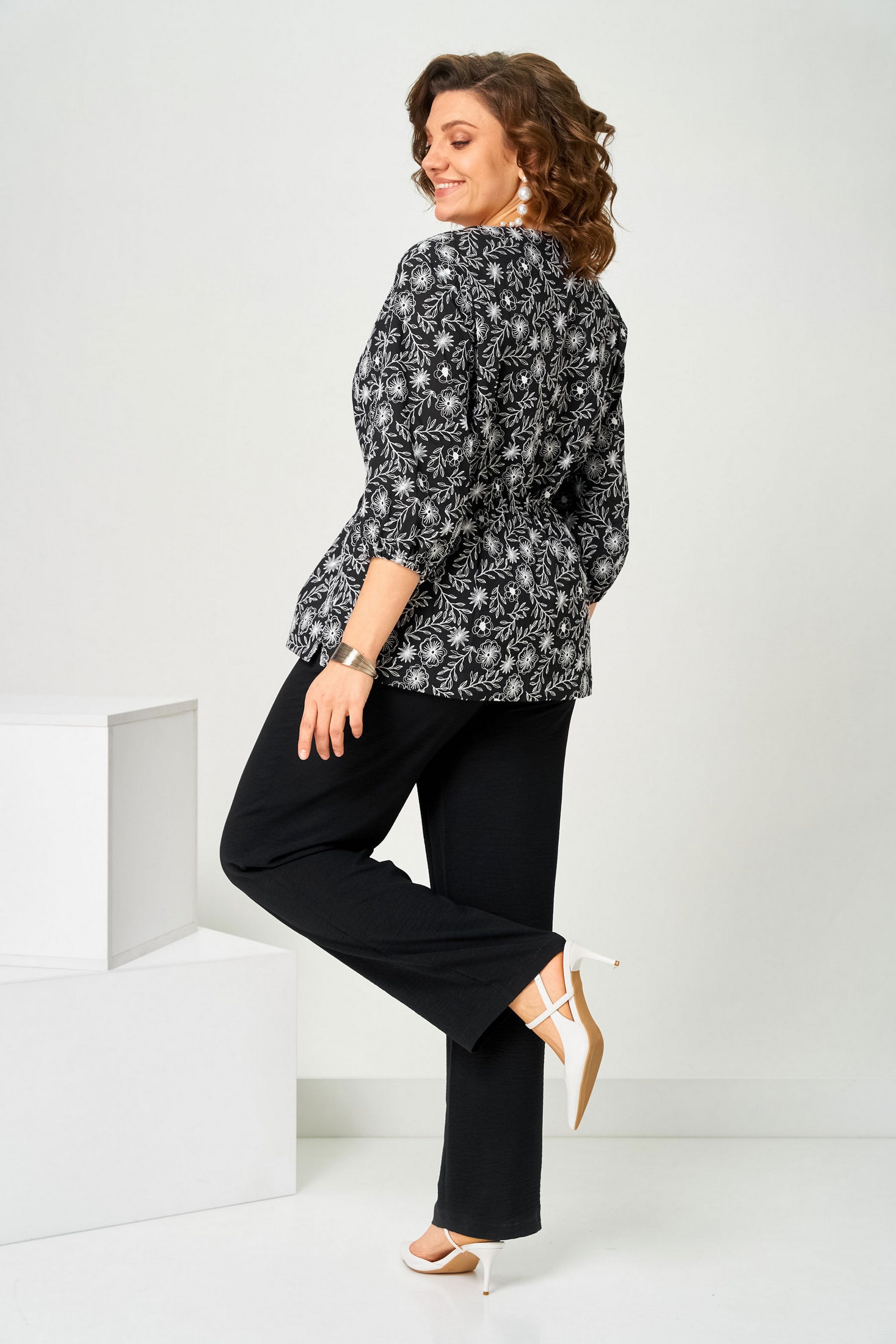 Костюм брючный 1516 Асолия из коллекции бренда представляют собой идеальное сочетание стиля и комфорта. Включая блузку из натурального хлопка и брюки из полиэстера, этот костюм обеспечивает уникальные ощущения на все сезоны весна-лета 2026. Блузка свободного силуэта с округлым вырезом и рукавами 3/4 на резинке по низу подчеркивает легкость изделия, а пояс, расположенный в боковых швах, добавляет элегантности. Черно-белый цвет узора делает костюм универсальным вариантом для нарядно-повседневных образов. Брюки со застежкой на гульфик и косыми карманами поддерживают удобство и практичность. Блузка имеет длину в 71 см, а брюки — 100 см, что обеспечивает идеальную посадку на рост 164 см.