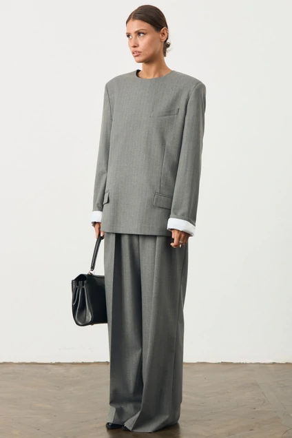 Жакет прямого свободного кроя. По переду бокавые клапаны. По спинке функциональная застежка на декоративные пуговицы. Рукав втачной, линия плеча слегка увеличена, есть подплечники. По низу рукава белая подкладка, которую можно использовать, как манжет. Жакет на подкладке. Длина жакета по спинке: 68 см Брюки прямого свободного кроя. Пояс стабильный. Брюки приталенные, расширенные к низу. По передней части прошитые швы.