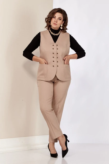 Костюм брючный женский с жилетом - это классическая модель для создания строгого офисного стиля. Зауженные брюки отлично подойдут для высоких и невысоких женщин. Брюки с боковыми карманами, застежка на молнию и пуговицу. Пояс брюк с резинкой. Жилет с V-образным вырезом, по полочке накладные карманы. Жилет на подкладке. Застежка навесные петли и пуговицы. Длина Брюк - 102 см. Длина Жилета - 62 см.