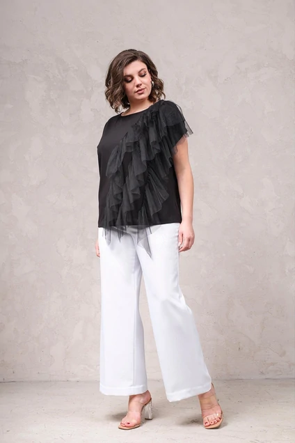 Комплект-двойка: брюки + блуза. Блуза из тонкого натурального трикотажа, по переду элегантная отделка из фатина, с цельнокроеным рукавом. Брюки прямого силуэта на резинке.