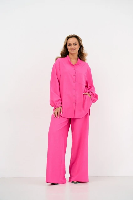 Комплект двойка из лёгкой натуральной ткани в модном розовом цвете. Рубашка свободного прямого кроя, слегка удлиненная по спинке. По переду застежка на пуговицы, по бокам рубашки разрезы.Рукав с манжетой на резинке. Брюки свободного кроя, пояс на резинке, по бокам функциональные карманы.