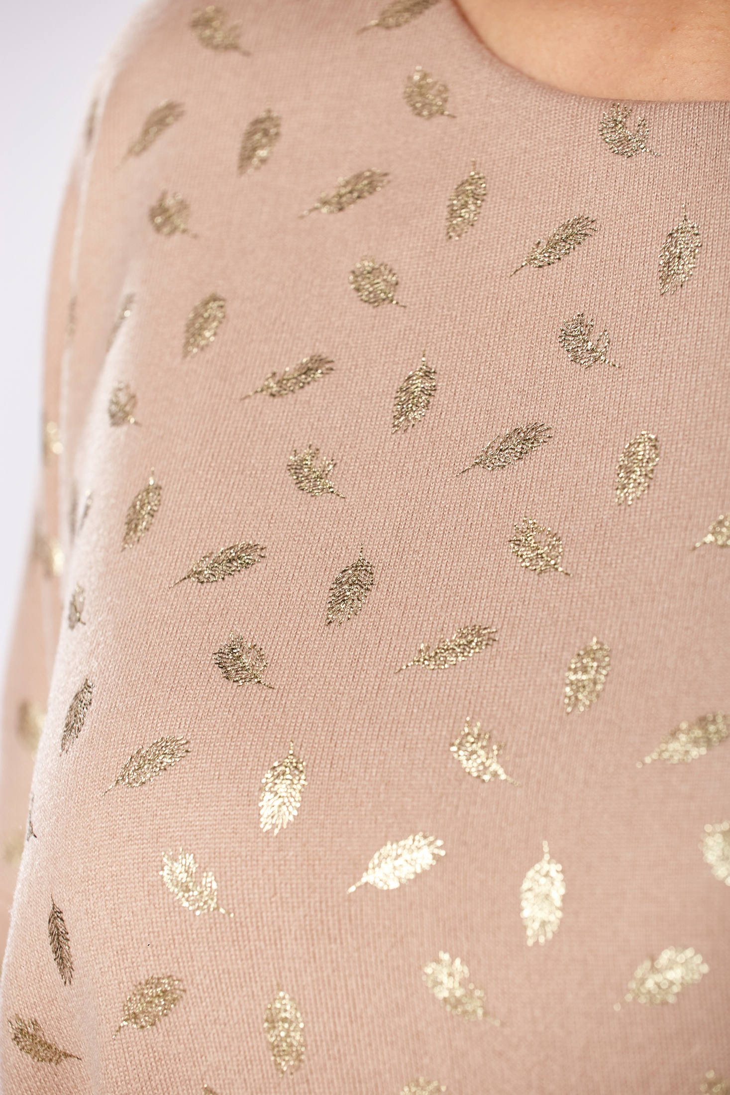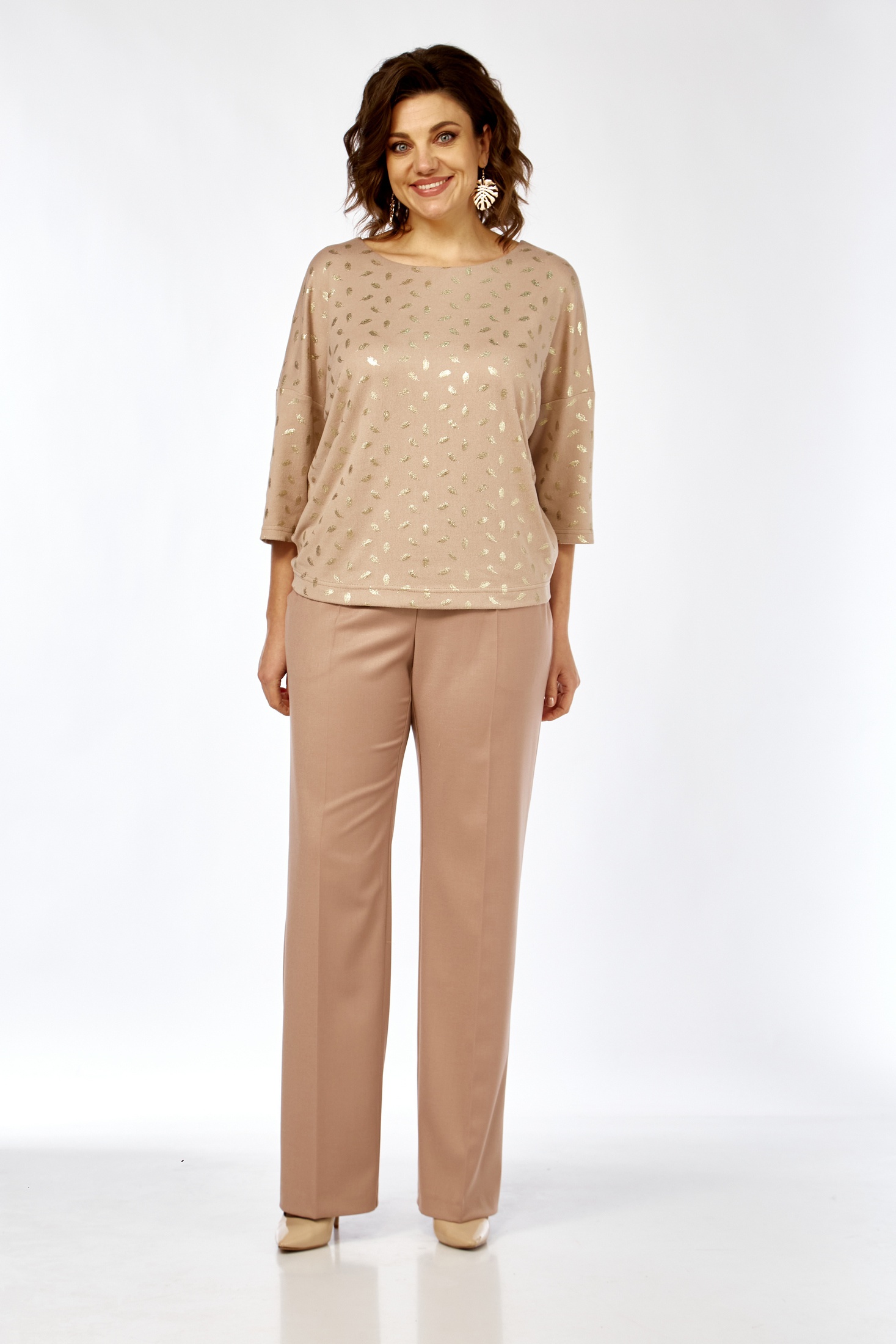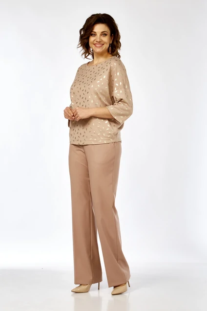 Костюм брючный 10035 AZZARA привносит в ваш гардероб идеальное сочетание комфорта и стиля. Коллекция бренда AZZARA предлагает комплект из джемпера и брюк, сочетающий в себе трикотажный верх с дизайном 'золотые перья' и однотонные костюмные брюки. Джемпер имеет рукав 3/4 длины и полукруглый вырез горловины, что обеспечивает свободу движений и стильный вид. Прямые брюки со стрелками и карманами удобны в носке благодаря резинке по спинке. Этот уютный и стильный комплект отлично подходит для повседневного и офисного стиля, выгодно подчеркивая ваш образ. Идеален для осенне-весеннего сезона, когда комфорт и практичность выходят на первый план. Нейтральный, бежевый оттенок делает его универсальным выбором для любого гардероба.
