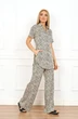 Элегантный женский брючный костюм c заметным современным оттенком. Костюм украшен мелким черно-бежевым принтом, который добавляет изделию текстильный изыск. Удлиненная блуза с воротником-стойкой на рубашечные пуговицы и спущенными рукавами с отложными манжетами эффектно сочетается с широкими свободными брюками. Брюки дополнены удобной частично эластичной тесьмой по поясу и застежкой на молнию с пуговицей спереди, обеспечивая комфортное ношение.