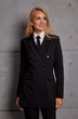 Комплект женский брючный, состоит из жакета, брюк, блузки и галстука. Жакет прилегающего силуэта, двубортный, с отложным воротником с лацканами, рукав втачной двухшовный со шлицей по низу, по переду и спинке вертикальный рельефы, карманы с клапанами, изделие на подкладке. Блузка из рубашечной ткани, с воротником на стойке, застёжка спереди на петли и пуговицы, рукав втачной с манжетой по низу, низ изделия фигурный. Брюки зауженные к низу, 7/8 длины, на поясе- кокетке со средней посадкой, со стрелками, застёжка спереди на молнию и пуговицы, со шлёвками для ремня. Галстук классический, узкий, из той же ткани, что жакет. блузка:хлопок-97%, спандекс-3%
