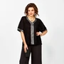 Женский нарядный двухпредметный костюм состоит из блузы и брюк с имитацией юбки спереди,выполнен из плательно-костюмной однотонной ткани с блестящим напылением.