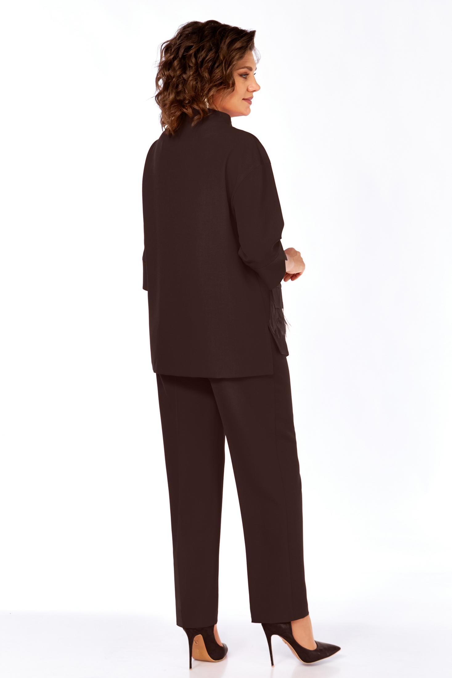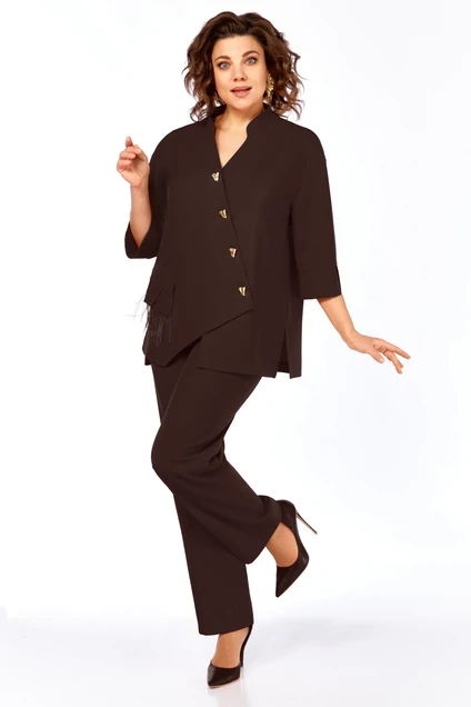 Костюм брючный 1090 шоколад Багира АнТа — это стильный и современный выбор для тех, кто ценит комфорт и элегантность. Коллекция бренда АнТа отличается уникальными фасонами и продуманным дизайном. Костюм выполнен из высококачественной плательно-костюмной ткани, состоящей на 65% из вискозы, что обеспечивает мягкость и комфорт, поддерживаемый добавлением полиэстера и лайкры для долговечности и эластичности. Жакет с асимметричной застежкой на пуговицы и декоративными элементами из тесьмы с перьями подчеркивает современный подход в создании одежды. Брюки прямые, зауженные к низу, с комфортной посадкой благодаря боковым вставкам из резинки. Шоколадный цвет добавляет изысканности, делая костюм идеальным для офисных встреч или деловых мероприятий. Это двухпредметный комплект, который подходит для осеннего и весеннего сезона.