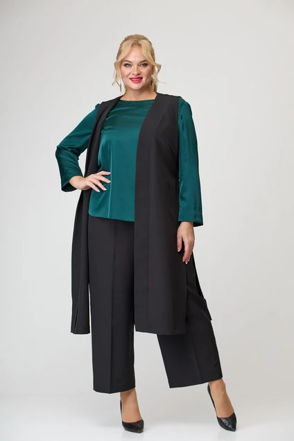 Комплект женский трехпредметный. Жилет свободного кроя без застежки. Перед жилета с отрезной планкой. Декоративным элементом жилета служит пояс обхватывающий спинку от бокового переда. Брюки прямого силуэта, прямые от бедра. Пояс на эластичной тесьме вкруговую. Блузка прямого силуэта. Рукав втачной одношовный с широкой подгибкой по низу, которая отворачивается в манжет. Боковые блузки имеют закругленную форму. Блуза-100% Вискоза,