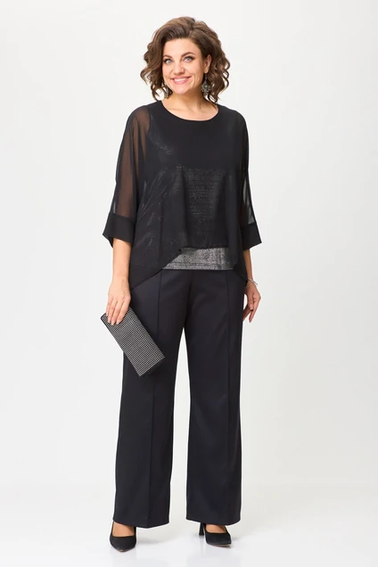Костюм женский, состоящий из блузки и брюк. Блузка выполнена в виде топа и шифоновой накидки, соединенных между собой по линии горловины. Перед топа выполнен из отделочной ткани с блеском, спинка из эластичной ткани. Накидка с цельнокроеным рукавом. Низ рукава обработан притачной манжетой. Сочетание двух силуэтов – полуприлегающего топа и свободной накидки, придают блузе женственность и романтичность. Брюки свободного кроя с боковыми карманами в шве. По передней и задней половинкам прострочена строчка-защип в 1-2мм по всей длине. Пояс притачной с частичной резинкой. Данная модель костюма подходит как для торжественного, так и повседневного назначения.