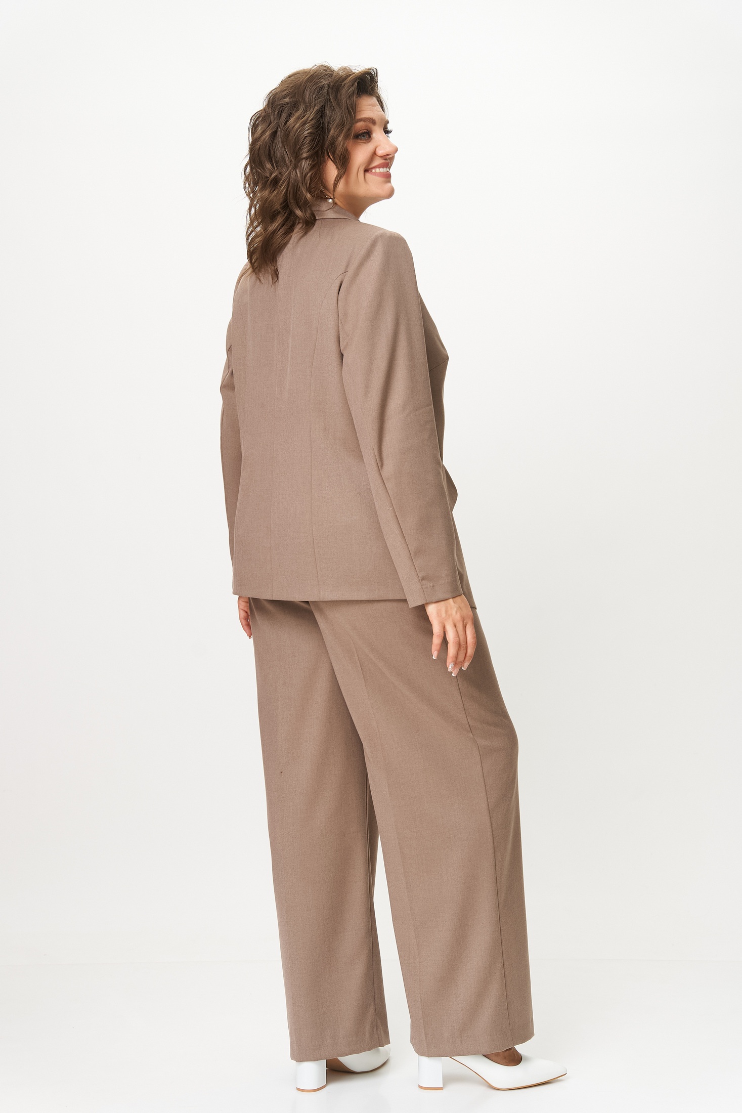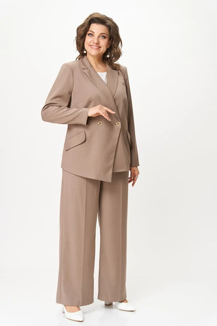 Костюм женский, состоящий из жакета и брюк. Жакет полуприлегающего кроя, с воротником пиджачного типа. Застежка двухботная, на 2 петли и пуговицы, с ассиметричными бортами. Полочка изделия с бочками, переходящими в функциональные карманы с клапанами. Спинка со средним швом. Рукав длинный, двухшовный. Жакет частично на подкладке. Классический крой и лаконичный дизайн позволяет легко сочетать его с другими предметами гардероба, создавая разные образы. Брюки слегка расширены. Верх брюк с притачным поясом, с частичной резинкой по спинке. Застежка на молнию и пуговицу на поясе. Перед брюк с карманами. Стрелки на брюках визуально вытягивают силуэт.