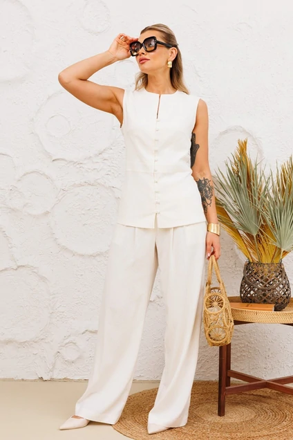 Летний брючный комплект из ткани лен -вишер, цвета натурального льна.