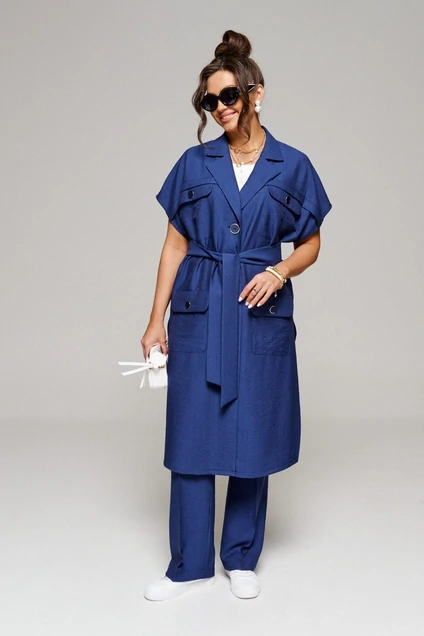 Кардиган прямого, свободного силуэта. На передней части предусмотрен декоративный подрез в виде кокетки с декоративными горизонтальными вставками в виде складки. Большие накладные карманы с клапанами создают стильный образ и дополнительное удобство. Спинка разрезная по среднему шву. В нижней части среднего шва спинки, а так же в боковых швах расположены дополнительные разрезы, которые придают изделию лёгкость и комфорт. Воротник стояче – отложной, пиджачного типа с лацканами. Застежка центральная, на пуговицы. Линия плеча спущена, рукав цельнокроеный. В качестве дополнительного элемента предусмотрен пояс – завязка.