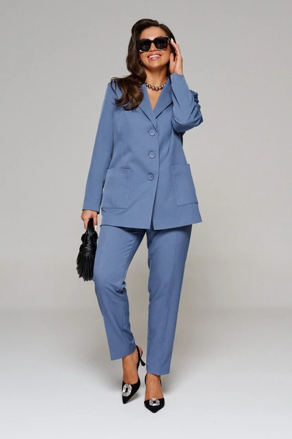 Классический, с деловым акцентом, женский костюм, состоит из 2-х элементов: жакета и брюк. Костюм выполнен из костюмной смесовой ткани.