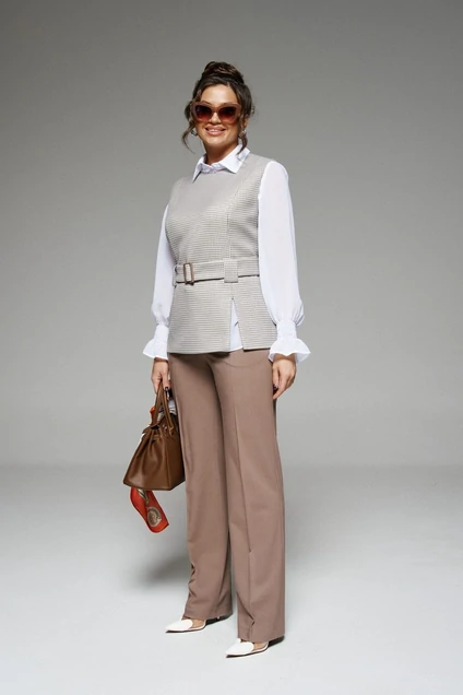 Деловой комплект 3-ка, состоящий из предметов: жилета, брюк и блузки.