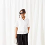 Блузка рубашечного типа выполнена из легкой, струящейся шифоновой ткани. Передняя часть блузки цельнокроеная с двумя нагрудными выточками. Застежка центральная на петли и пуговицы. Спинка цельнокроеная с двумя выточками на уровне талии. Нижний край блузы ровный. Воротник рубашечный, на стойке. Рукав длинный одношовный втачной. Нижний край рукава декоративный.