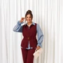 Жакет прямого силуэта; однобортный; на подкладке. Перед цельный с нагрудной вытачкой под лацканом. На передней части жакета предусмотрены два функциональных, симметрично расположенных кармана с листочкой. Спинка ассиметричная. На левом плечевом срезе расположена вытачка, а на правой стороне предусмотрен декоративный вертикальный подрез со шлицей, которая фиксируется двумя большими, декоративными пуговицами. Рукав длинный двухшовный втачной. Воротник классический, стояче-отложной, пиджачного типа с лацканами. Застежка центральная на три петли и большие декоративные пуговицы.