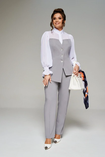 Женственный и в то же время лаконичный образ, который поможет сделать любой день особенным, несомненно можно найти в изысканном комплекте из жилета, имитирующего корсет с романтической блузкой, и элегантных брюк. Выполнен в комбинации из костюмно-смесового полотна с нежной, бархатистой фактурой, приятной на ощупь и матовой поверхностью и полупрозрачного невесомого и необыкновенно нежного шифона.