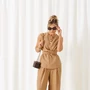 Брюки длинные, слегка заужены к низу; в спортивном стиле; выполнены из смесового полотна с содержанием натуральных волокон. Посадка классическая, высокая. Без застежки. Спереди расположены боковые функциональные карманы со складками, придающие объём. Пояс на резинке, шириной 4см., с отделочной строчкой по середине.