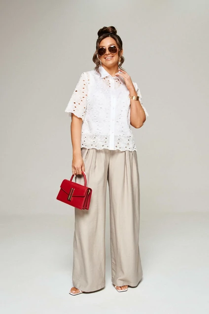 Брюки «палаццо» - акцент комплекта. Широкие с карманами в верхней части бокового шва и глубокими складками по переду. Застежка центральная, классическая, на молнию и петлю с пуговицей на поясе. Пояс брюк притачной, с резинкой сзади, что придает изделию дополнительный комфорт при носке.